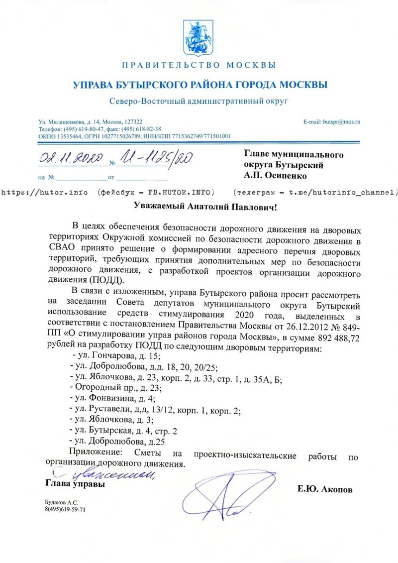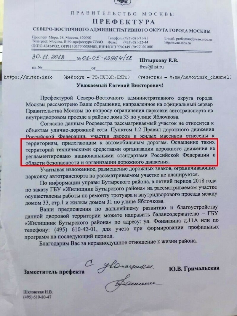 Заместитель главы управы Бутырского района уже подготовила ответ по одному из одиннадцати указанных адресов, в котором напомнила сотрудникам транспортного ведомства, что оснащение дворовых территорий техническими средствами организации дорожного движения не регламентировано национальными стандартами Российской Федерации в области безопасности и организации дорожного движения. Общим решением муниципального совета вопрос об организации движения во дворах Бутырского района с повестки заседания был снят и вынесен на отдельное заседание транспортной комиссии.