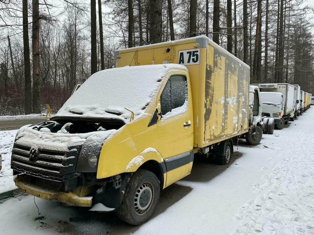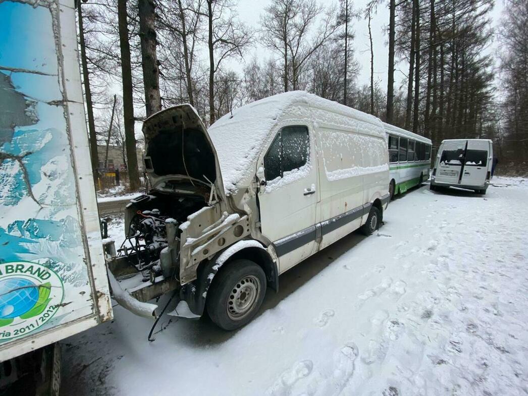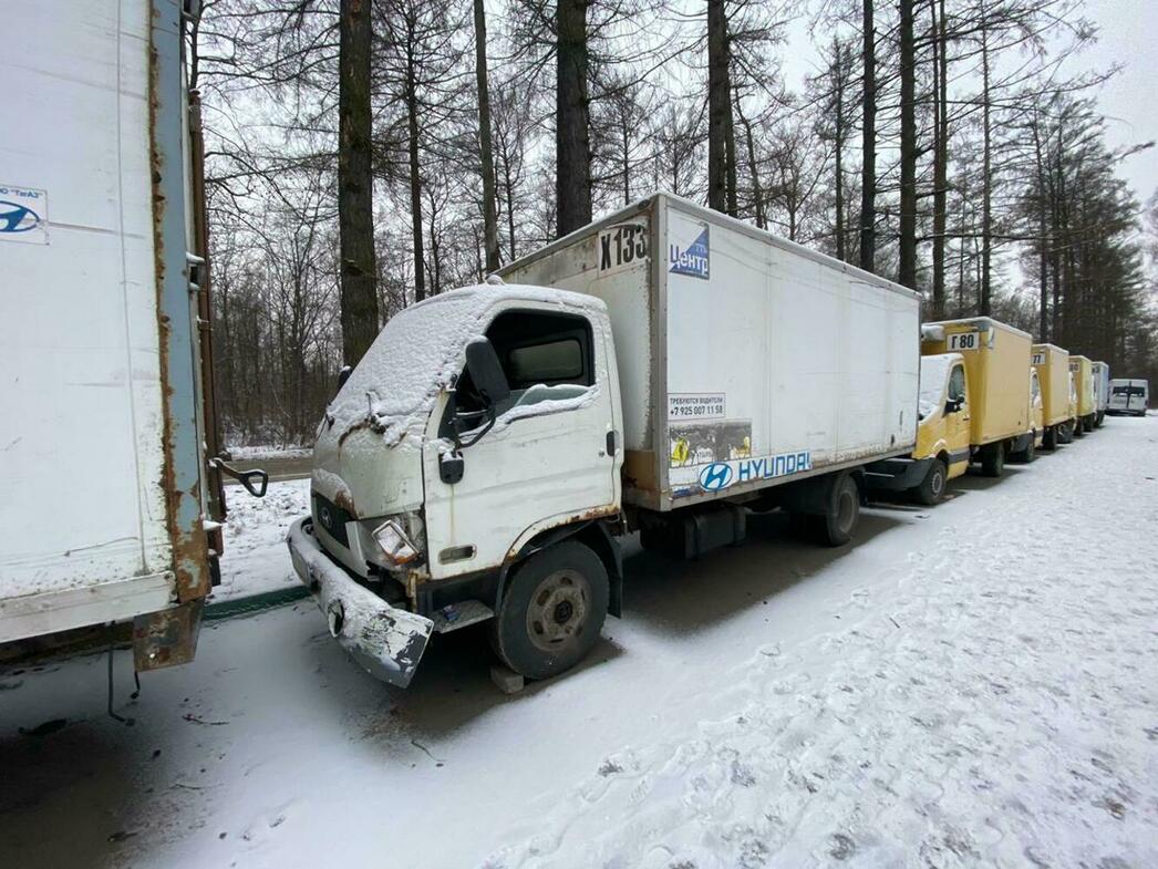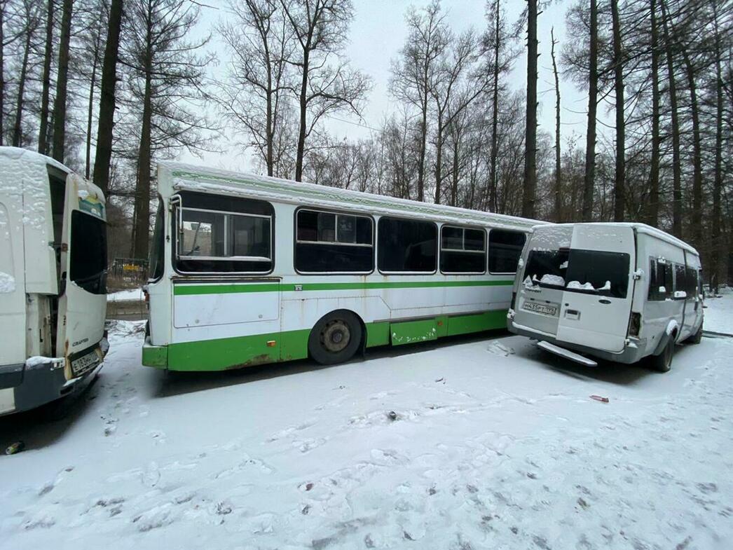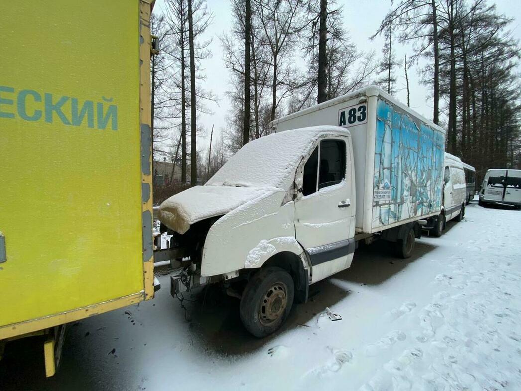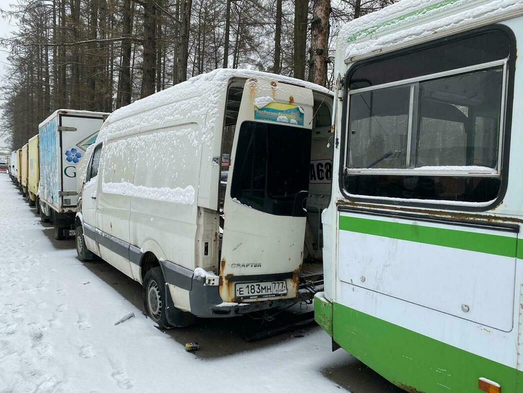 В отстойнике собраны разбитые и уже частично разобранные MAN, Volkswagen Crafter и Caddy, Hyundai Porter, Ford Transit, а также автобус ЛиАЗ.