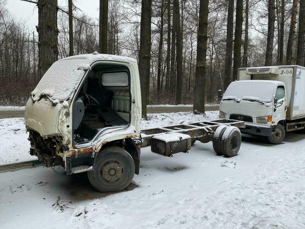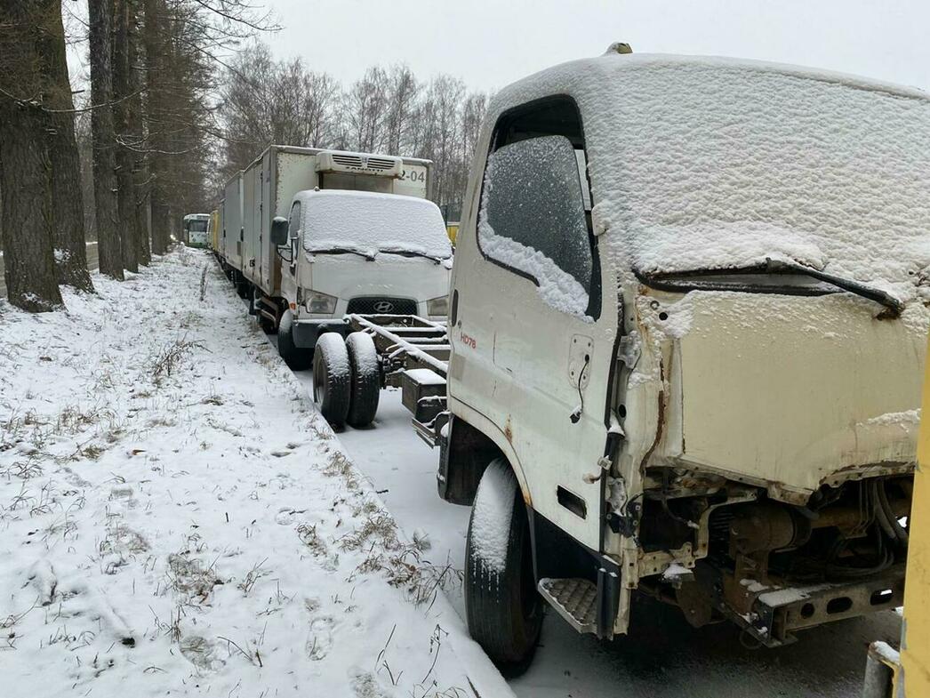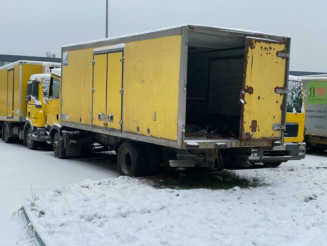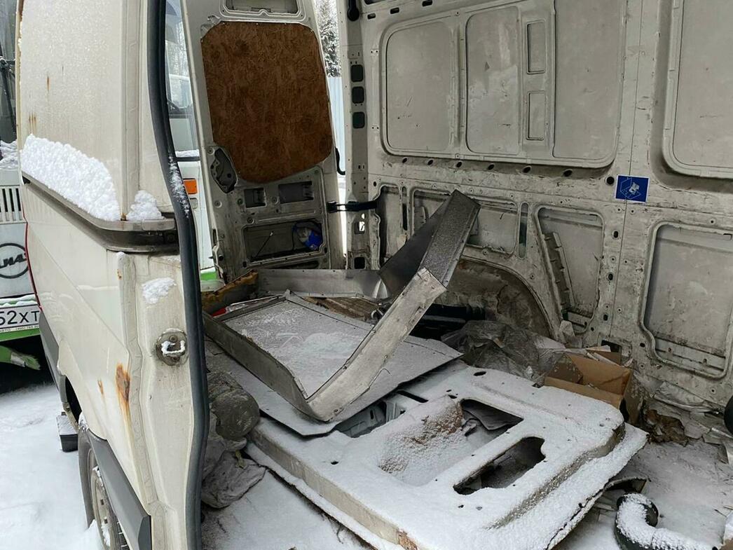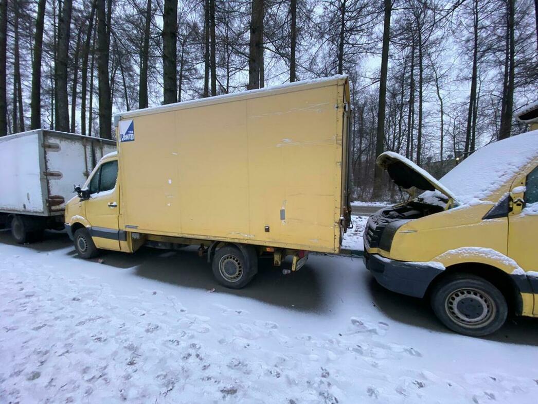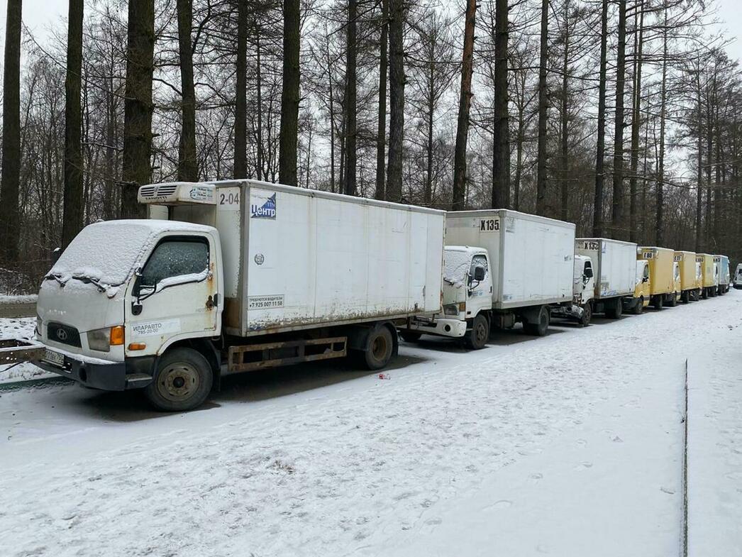 В отстойнике собраны разбитые и уже частично разобранные MAN, Volkswagen Crafter и Caddy, Hyundai Porter, Ford Transit, а также автобус ЛиАЗ.