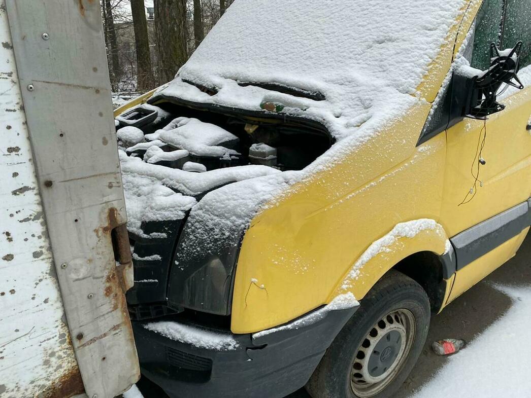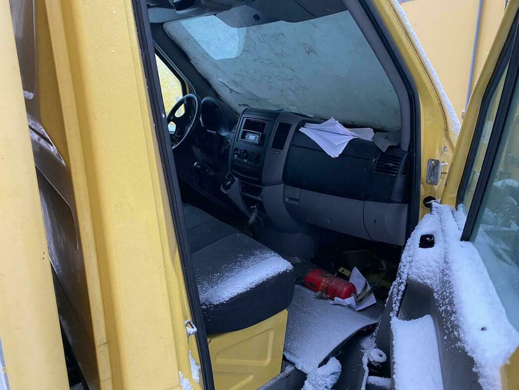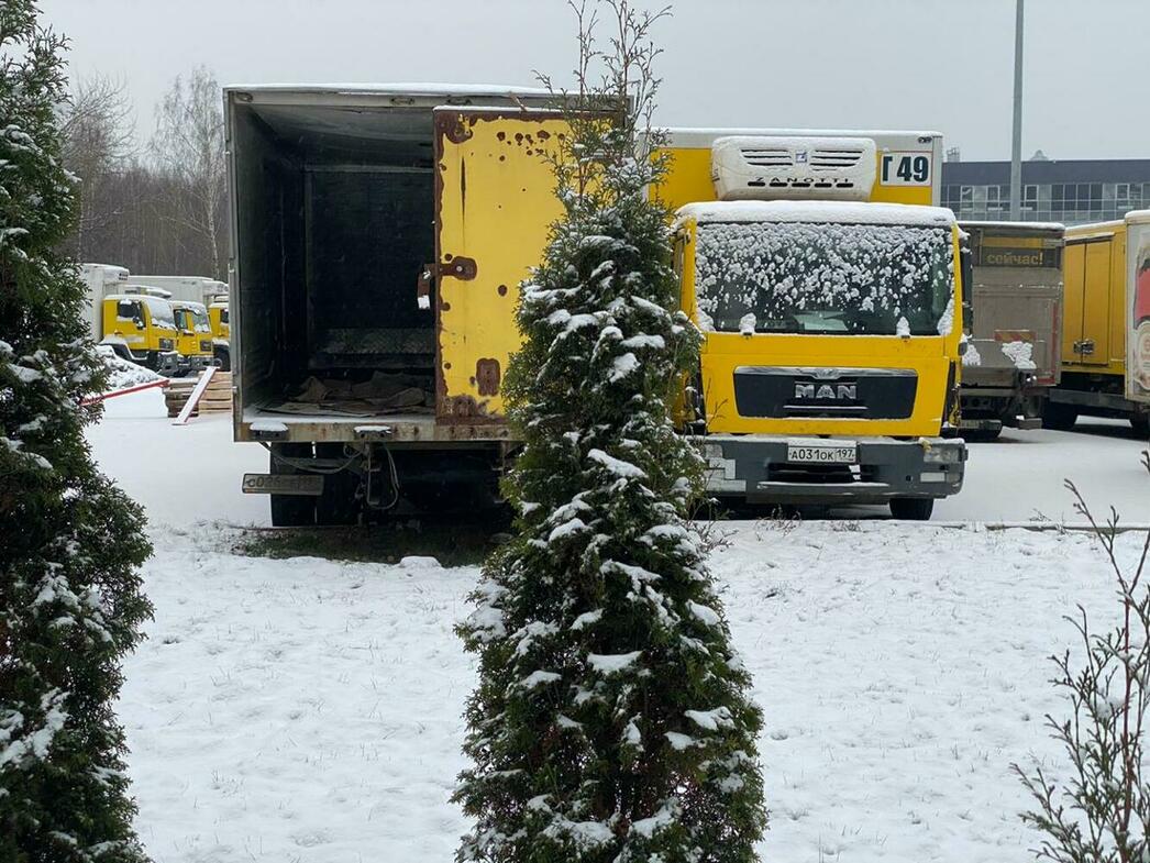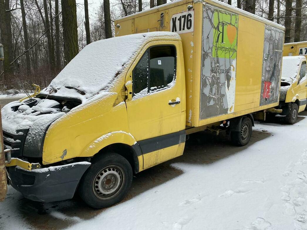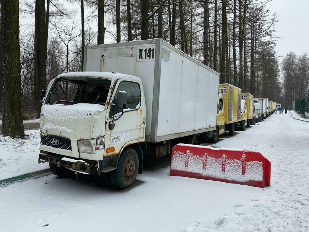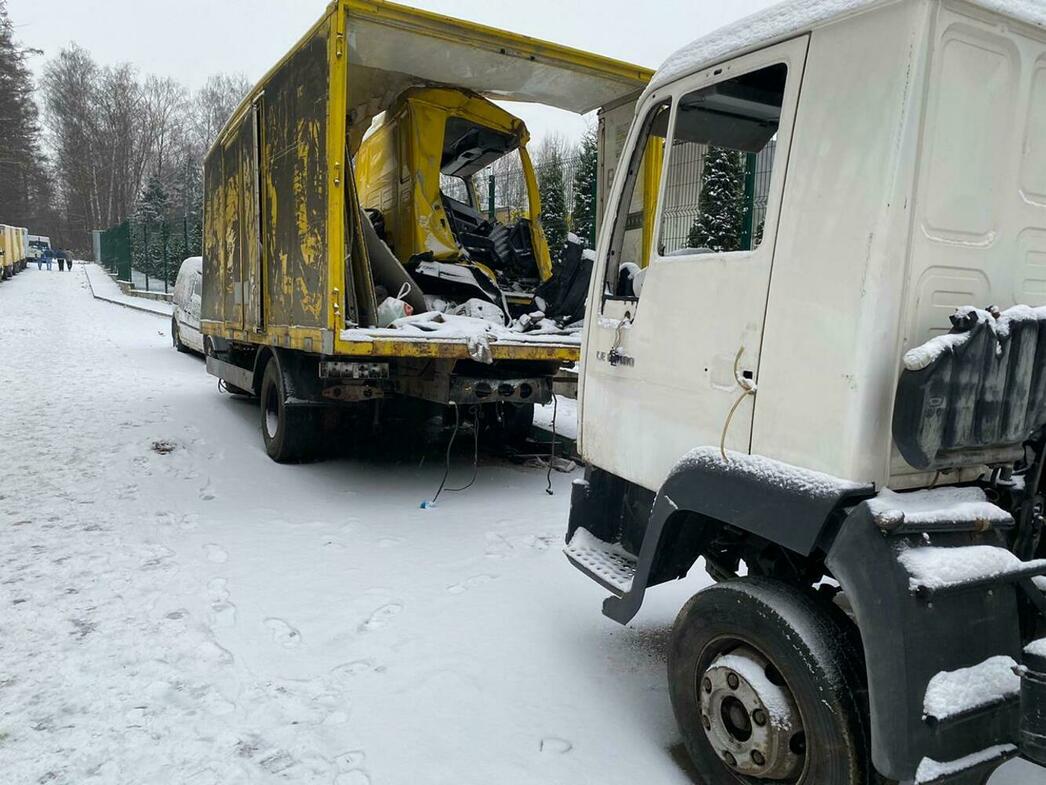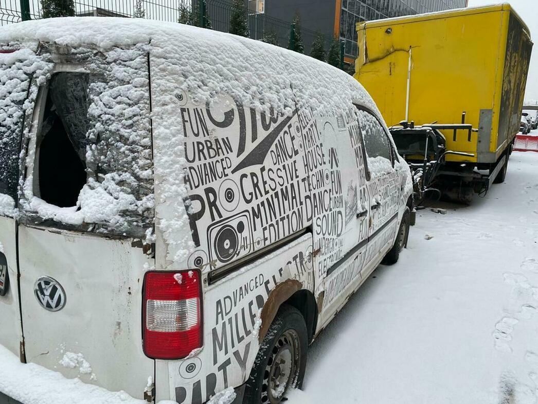 В отстойнике собраны разбитые и уже частично разобранные MAN, Volkswagen Crafter и Caddy, Hyundai Porter, Ford Transit, а также автобус ЛиАЗ.