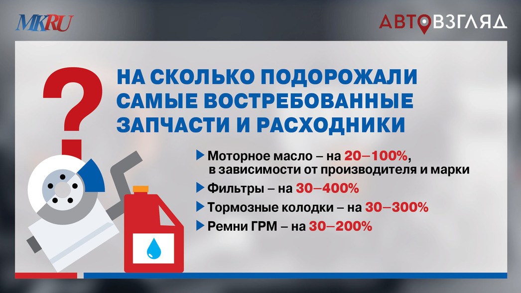 Подорожание по большей части обусловлено увеличением стоимости запчастей и расходников. Как во время пресс-конференции газеты «Московский Комсомолец» и портала «АвтоВзгляд» рассказала Мария Посеницкая, директор независимого техцентра «Автосвита», цены на моторное масло, например, выросли до 100%, на фильтры — до 400%, тормозные колодки — до 300%, а ремни ГРМ — до 200%.