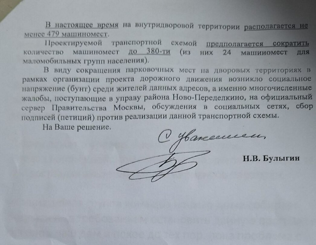 Удивительно, но, по некоторым данным, уважаемый глава управы района Ново-Переделкино в своем обращении к вышестоящему руководству по поводу реакции граждан на планируемый «депаркинг» якобы указал, что сейчас на обозначенной внутридворовой территории располагается «не менее 479 машиномест». Но, как уже замечено выше, в реальности машин во дворах в разы больше. При этом чиновник якобы уточнил, что проектируемая транспортная схема предполагает сократить число машиномест до 380, включая 24 позиции для маломобильных групп населения.