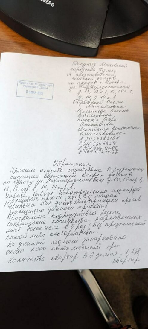 В ходе открытого общения с жителями района 22 марта, лично глава районной управы Николай Булыгин признал наличие планов заметно сократить количество парковочных мест в конкретной части отдельно взятого микрорайона. Но озвучил пожелание, чтобы несогласные с таким развитием событий поднимали эту тему и направляли соответствующие обращения в его ведомство. То есть пообещал принять во внимание мнение людей. В свою очередь, жители последовали этому совету — начали присылать прошения с изложением своих переживаний, опасений и возражений, связанных с грядущим кардинальным сокращением стояночных мест.
