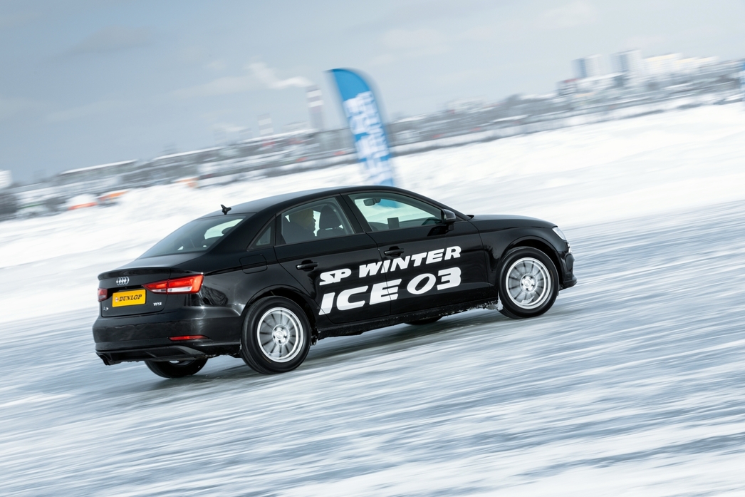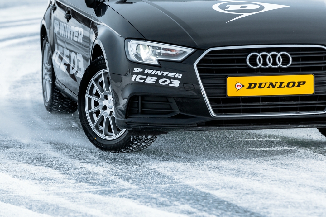На тесте были представлены две модификации: покрышки для легковушек Dunlop SP Winter ICE 03, установленные на Audi A3, и «обувка» для кроссоверов и внедорожников Dunlop Grandtrek ICE 03, которой были укомплектованы Toyota Land Cruiser 200. Испытания проходили на огромной ледовой трассе, где вдоволь можно было поюзать резину на различных скоростях и типах покрытия.