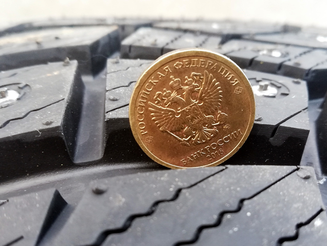 Понимаю, что 170-километровый пробег в таком режиме — не показатель живучести шипов, но тем не менее. Поднимаю «крузак» на домкраты и осматриваю колеса на предмет потерь. На вид все «коготки» на месте. Пальцами проверяю, не разболтались ли они в посадочных гнездах. Но все в порядке — сидят, как влитые. На презентации Ice 03, помнится, рассказывали, что инженеры компании Dunlop, дабы повысить надежность фиксации шипа в протекторе, увеличили так называемую пятку. Что ж, и впрямь рабочая технология, а не маркетинговый ход — шипы держатся очень достойно. Ну, и пара слов об износостойкости резины в целом.