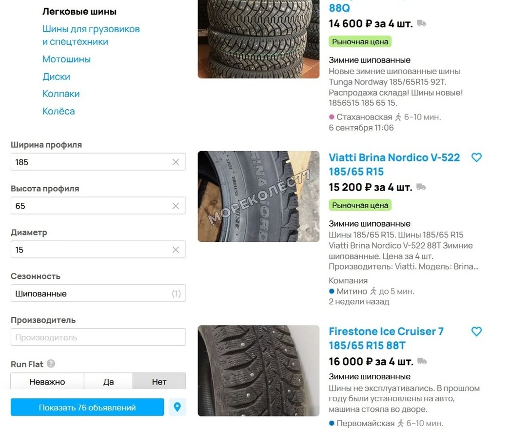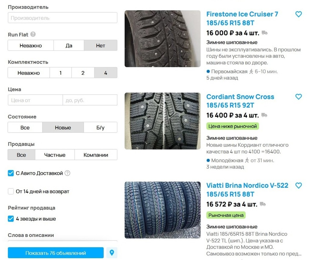 Чем удобен этот ресурс, так это возможностью одновременно искать подходящий вариант не только в удобной покупателю географической локации, но и выбирать как среди новых покрышек, так и среди б/у. Сейчас на платформе размещено более 3,8 миллиона объявлений о продаже шин, из них почти половина — о продаже новых покрышек.