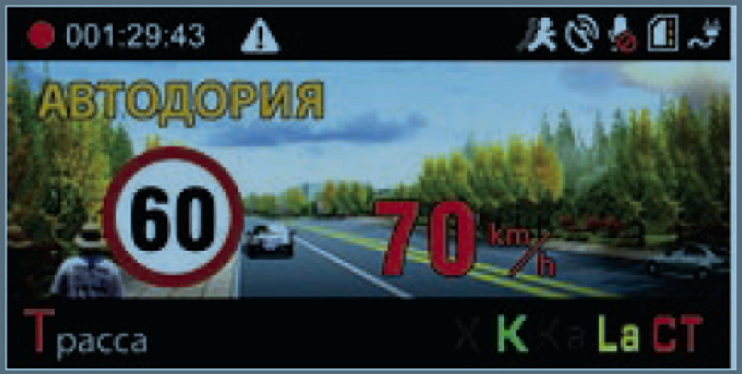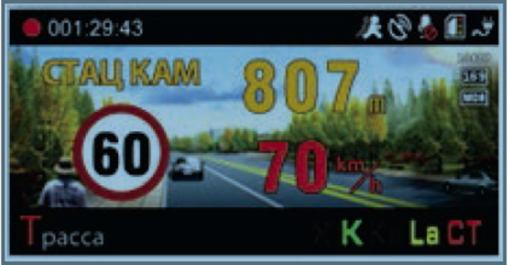 На дисплей PlayMe P300 TETRA выводятся тип камеры (1); установленный скоростной режим (2); расстояние до камеры (3); текущая скорость или текущая средняя скорость на участке, контролируемым «Автодорией» (4); уровень сигнала радара (5); диапазон сигнала радара (6).
