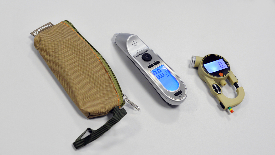 Первой в наши руки попала модель манометра под названием Berkut Digital PRO. Устройство обладает продуманной эргономикой и выполнено в форме карабина, который можно пристегнуть, например, к поясному ремню. Оно удобно лежит в руке. Информация о давлении с высокой точностью отображается в цифровом виде на жидкокристаллическом дисплее с яркой подсветкой для работы в темное время суток. Кроме того, в корпус манометра инсталлировано еще и приспособление для замера глубины протектора шины, а также резьбовой штуцер для хранения колпачка ниппеля.
