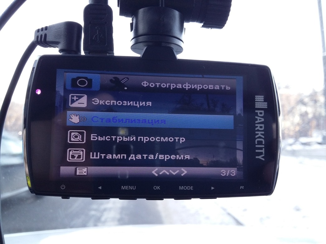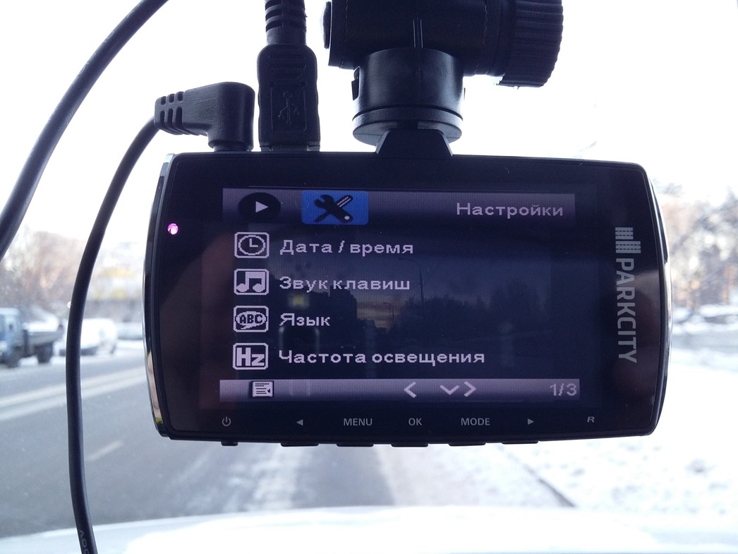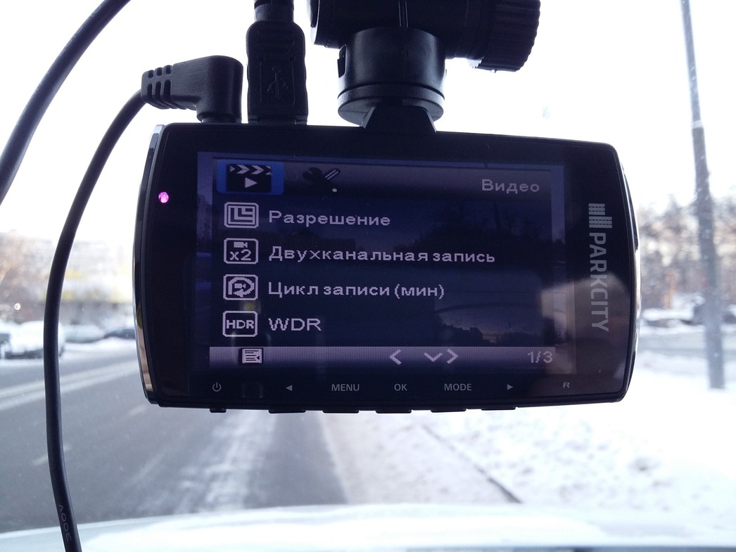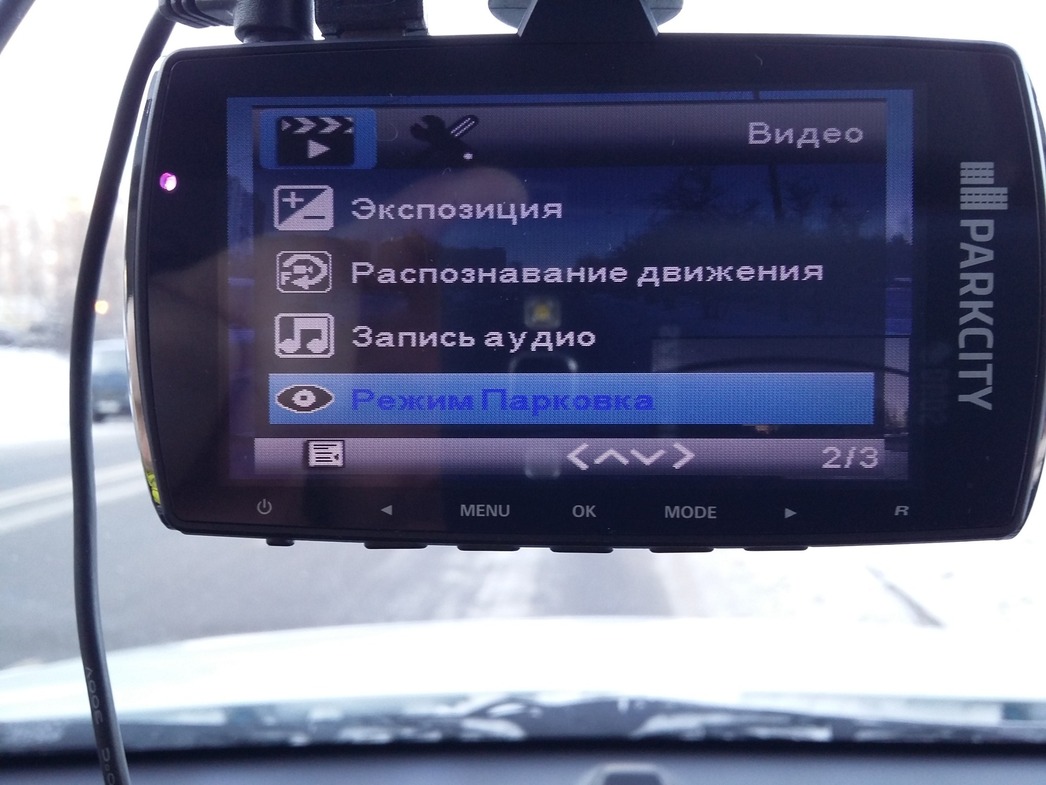 Смонтировав систему видеофиксации, мы, как всегда без инструкции, принимаемся за ее освоение. Включаем прибор и — вперед. Корпус ParkCity DVR HD 475, кстати, выполнен в стиле «под фотоаппарат»: плоская прямоугольная коробочка из матового пластика с объективом на одной стороне и трехдюймовым цветным дисплеем на другой. Шесть кнопки управления гаджетом невелики по размеру и расположены на нижней грани висящего на стекле устройства. Несмотря на миниатюрность, пользоваться ими удобно, поскольку кнопульки слегка выступают из корпуса устройства. Они легко находятся даже на ощупь, когда возникает необоримое желание поковыряться в меню прибора прямо на ходу. При этом каждая отвечает за одну функцию: включение устройства, вход в меню, две «стрелочки» перемещения по меню, «ОК» и, наконец, кнопка смены режима работы гаджеты. Их тут, кстати, несколько.