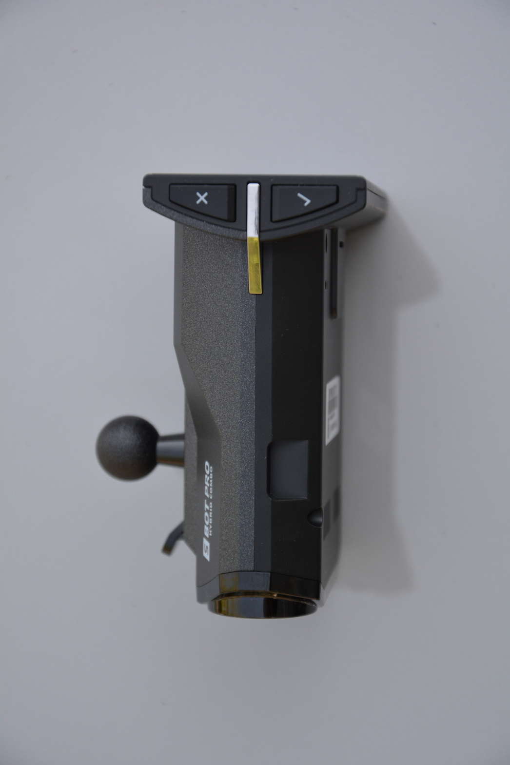 Пластиковый корпус устройства выполнен в подчеркнуто-угловатом стиле, изобилуя гранями и плоскостями. Из-за такого брутального дизайна он смотрится намного крупнее, чем есть на самом деле. Собственно, по этой причине мои изначальные подозрения, что присоска кронштейна гаджета будет отваливаться от лобового стекла чуть ли не на каждом «лежачем полицейском» развеялись очень быстро.