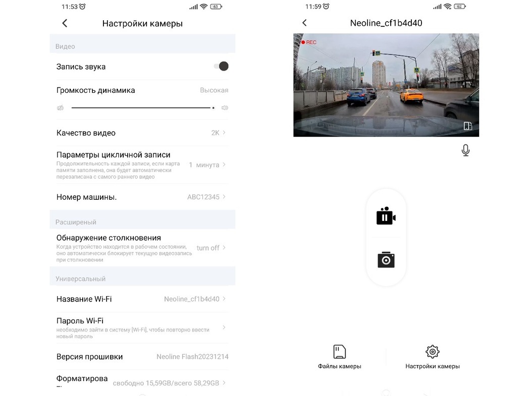 В приложении на смартфоне можно наблюдать видеопоток с камеры девайса в реальном времени, делать моментальные фото, просматривать уже отснятый материал, разложенный по папкам (обычное видео, аварийное, парковка). Можно настраивать длительность времени записи файла, качество записи (2K или FHD), тип записи в стояночном режиме (если обеспечено питание устройства при выключенном двигателе), громкость динамика, и прочее.