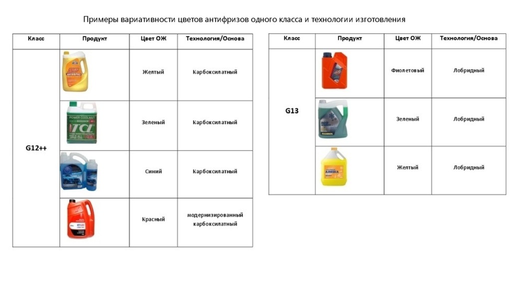 Антифризы одного цвета могут быть разными по технологии изготовления и при смешении давать химические реакции типа хлопьев, пено- или газообразования — из-за спорящих друг с другом присадок. Антифризы одного класса могут быть разного цвета и вдобавок не иметь на этикетке подписи G11 или G12: там может быть указана температура застывания, технология или основа ОЖ — «Лобридный антифриз» или «ОЖ на основе моноэтиленгликоля».