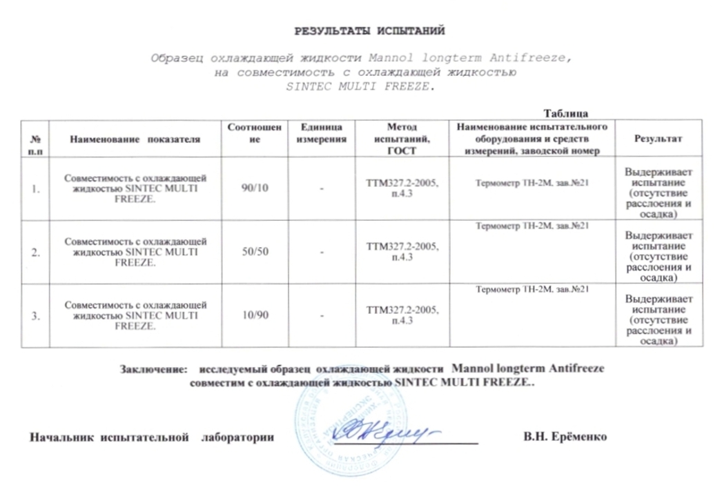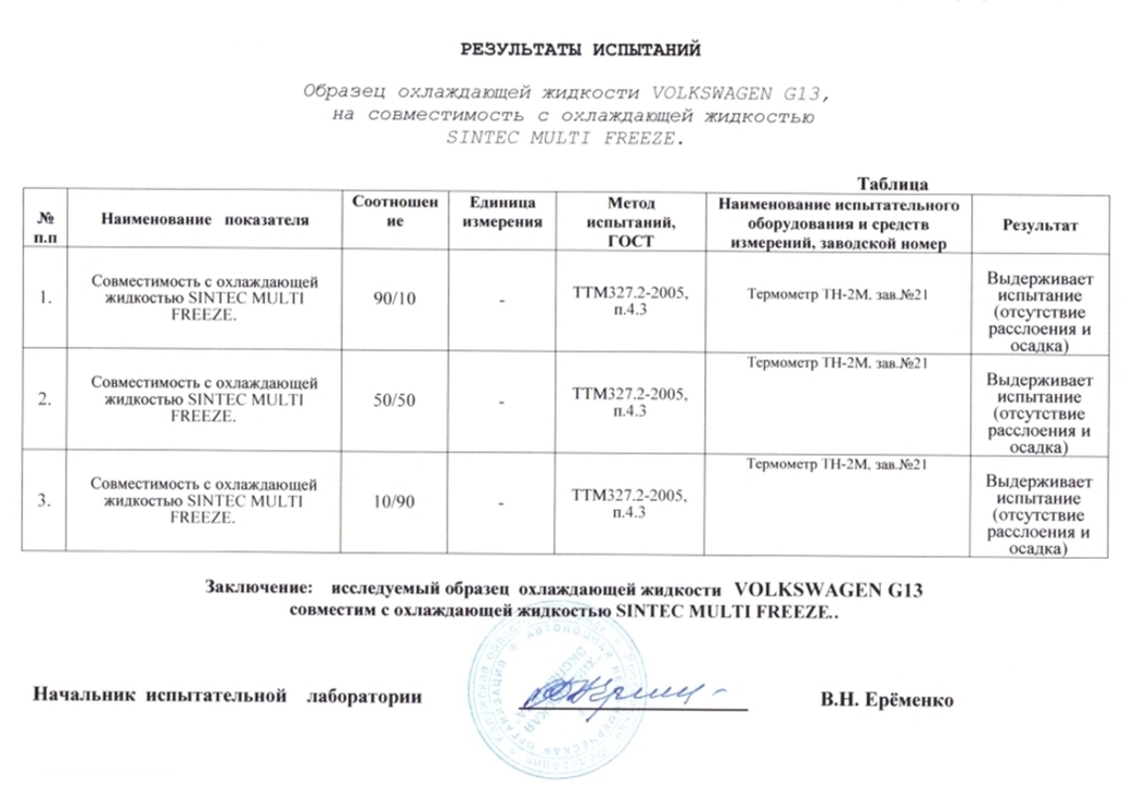 Лабораторные испытания показали, что Мультифриз от Sintec можно применять на любых типах бензиновых и дизельных двигателей. Тесты подтвердили неагрессивность Sintec Multifreeze к внутренним частям двигателя, изготовленным из любых применяемых сегодня материалов (алюминий, кремний, медь, латунь, магний, чугун) при смешивании с любым типом ОЖ. Результаты испытаний — в таблице.