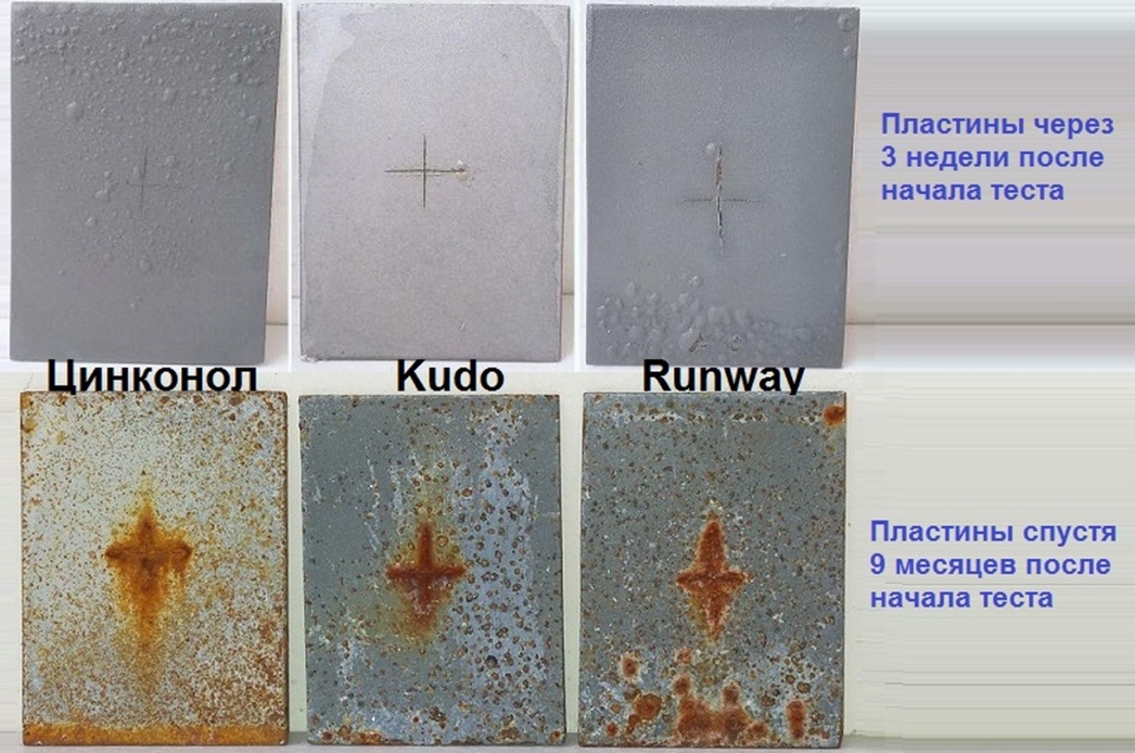 Что касается антикоррозионных свойств остальных трех продуктов (аэрозольных оцинковок Kudo, Runway и «Цинконол»), то первый этап они завершили с большими издержками. Основным недостатком стало отслоение защитного покрытия. Причем наиболее сильно данный дефект проявился у отечественного «Цинконола» — мелкие вздутия его цинкового слоя отмечены практически по всей поверхности контрольной пластины.