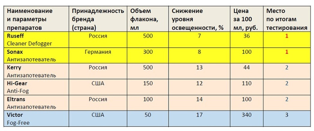 Итак, в рамках отмеченной выше методики лучшую эффективность продемонстрировали отечественный спрей Ruseff и немецкий аэрозоль Sonax, закрепившие за собой статус победителей нынешнего теста (фото ниже). При проверке их действия зафиксировано наименьшее (8—9%) среди прочих участников относительное снижение уровня освещенности после выпадения конденсата.