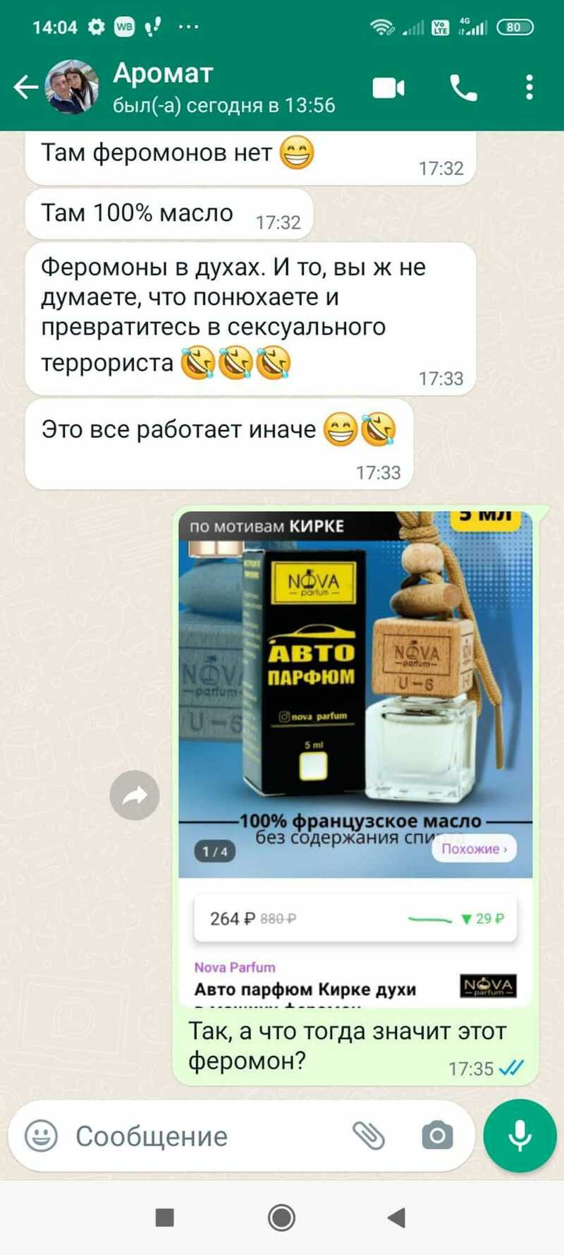 Огорчившись провальным эффектом, решила вступить в почти интимную переписку с производителем (контактный телефон указан на упаковке) чтобы узнать, почему же мои изыскания потерпели фиаско? На том конце надо мной только посмеялись, заявив, что, оказывается, никаких феромонов в «благовониях» нет — только масло.