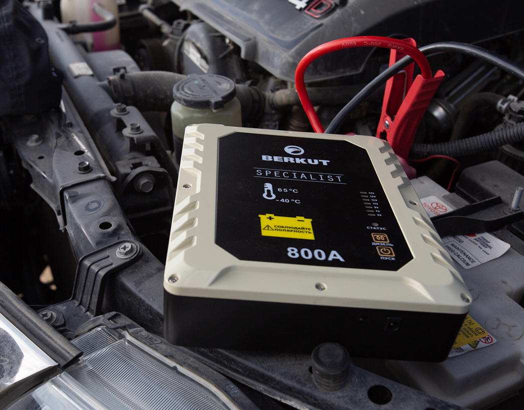 На практике это выглядит так. Подсоединяем Berkut JSC-800С к клеммам разряженного аккумулятора, нажимаем кнопку «ПУСК» и ждём, когда индикация на устройстве покажет его боеготовность, затем смело ключ на старт и запускаем двигатель. Это конденсаторное пусковое устройство подходит для любых типов транспортных средств с бензиновыми двигателями до 6 литров и дизелями до 4 литров. Для последних есть специальный режим «ДИЗЕЛЬ», используемый для прогрева свечей накаливания.