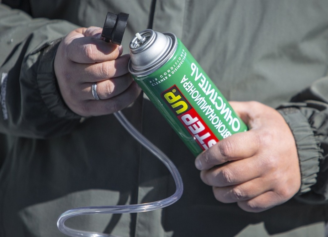 Если автомобиль еще молод и полон сил, то подойдет самый простой и доступный метод — «Освежитель кондиционера» марки StepUp, который очистит и обеззаразит систему кондиционирования и воздух в салоне. Покупать специальную отвертку и ломать тонкие клипсы пластиковых деталей не потребуется — профессиональная химия уничтожит бактерии и вирусы в системе, предотвратив их дальнейшее размножение, без разборки салона. Методика весьма проста: заводим авто, включаем систему рециркуляции воздуха и кондиционер на полную мощность, закрываем окна и ставим на пол в ноги пассажирского кресла переднего ряда флакон с очищающей жидкостью. Зафиксируем клавишу, и препарат начнет подавать мощный поток «химии», которая по умолчанию будет «всасываться» в систему — рециркуляция ведь включена. Салон автомобиля следует покинуть, дав составу поработать весь отведенный срок.