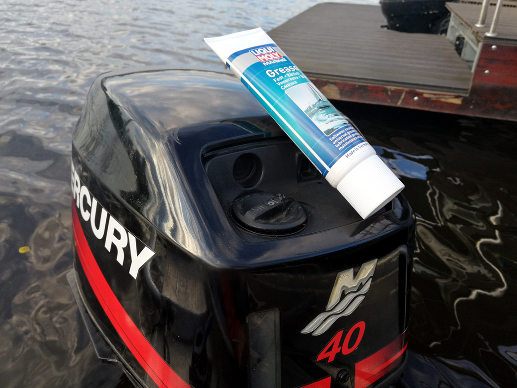 Если открыть кожух подвесного мотора, то под ним мы увидим механизм ручного стартера и всякие приводные детальки от румпеля. И эти механизмы так же нуждаются в смазке. И не абы какой, а специальной, предназначенной именно для водной техники. В ассортименте компании Liqui Moly есть спецсостав Marine Grease.