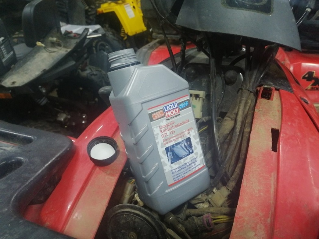 Ну и коль мы коснулись вопроса перегрева, то при подготовке своего ATV к лету, посмотрите состояние сот радиатора. Да и вообще — убедитесь, что в системе охлаждения присутствует достаточное количество антифриза. Если радиатор имеет наливную горловину, то обязательно отверните пробку и убедитесь, что внутри теплообменника нет накипи. Обнаружили «окаменелости» или заметили что антифриз мутный — промывайте систему охлаждения. Недорогое и крайне эффективное средство Motorbike Kuhler Reiniger от производителя Liqui Moly, растворяет накипь и загрязнения в радиаторах, патрубках и водяной рубашке двигателя. Очиститель удаляет эти отложения и обеспечивает нормальную работу системы охлаждения. Motorbike Kuhler Reiniger не содержит агрессивных кислот и щелочей и в целом применять этот состав следует при каждой замене охлаждающей жидкости.