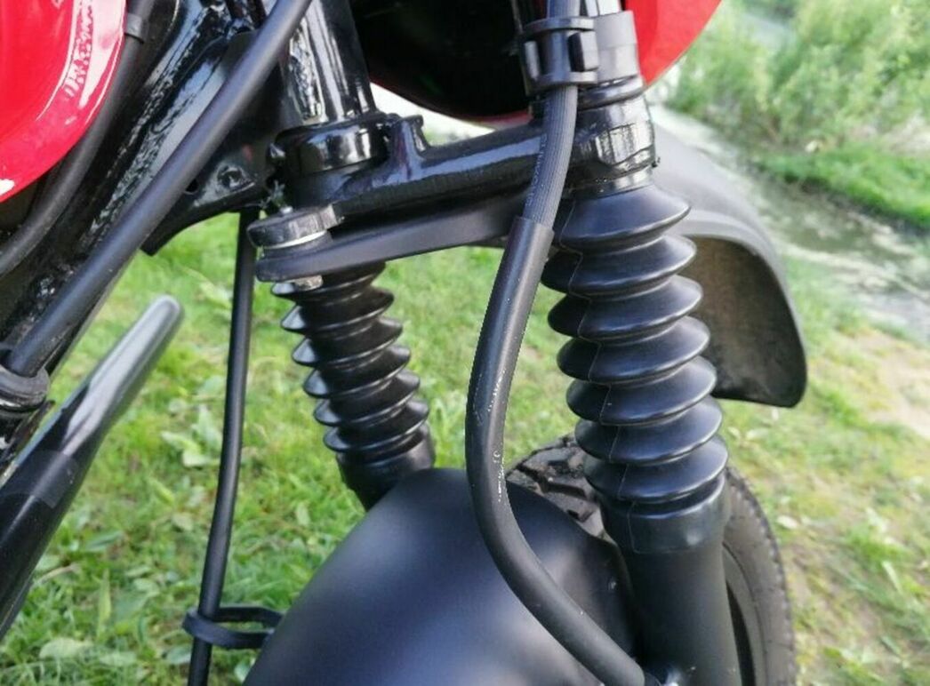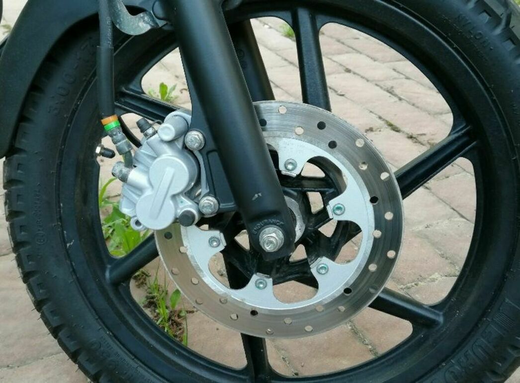 Передняя подвеска оснащена телескопической вилкой с увеличенным ходом, «перья» спрятаны в резиновые кожухи, что предотвращает попадание грязи и пыли на штоки. Подвеска отрабатывает прекрасно, даже при попадании колеса на скорости в яму, руль из рук не вышибает и мотоцикл сохраняет устойчивость.