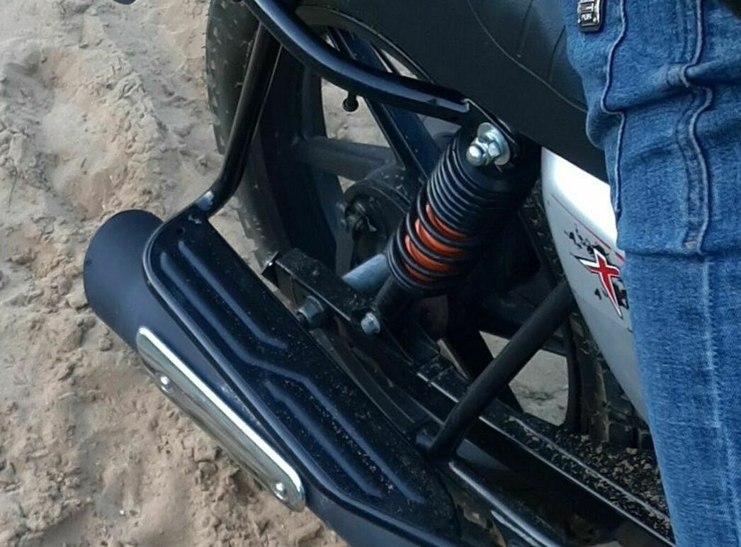 Во-вторых, в стоковой версии Boxer 150 уже есть небольшие дуги безопасности, которые защищают ноги «райдера» при маневрировании между деревьев на пересеченной местности или в случае падения вместе с мотоциклом на бок. Безопасности пассажира конструкторы Bajaj так же уделили самое пристальное внимание. Подножки для ног пассажира здесь представляют из себя не хлипкие складные кронштейны, а полноценные площадки из прочных металлических труб. Чтобы шнурки от обуви или штанина того, кто сидит позади, не попали под приводную цепь, она спрятана в защитный кожух. Да и сама цепь в таком коробе пачкается меньше, а значит её обслуживание требуется не так уж и часто. На заднее колесо мотоцикла, установлен специальный защитный каркас, чтобы свисающие элементы одежды не намотались на него во время движения. В-третьих, индийский 150-«кубовый» мотоцикл оснащен полным комплектом светотехники, зеркалами и продается в России с ПТС. Иными словами он ставится на учет в ГИБДД и на нем совершенно легально можно ездить по дорогам общего пользования.