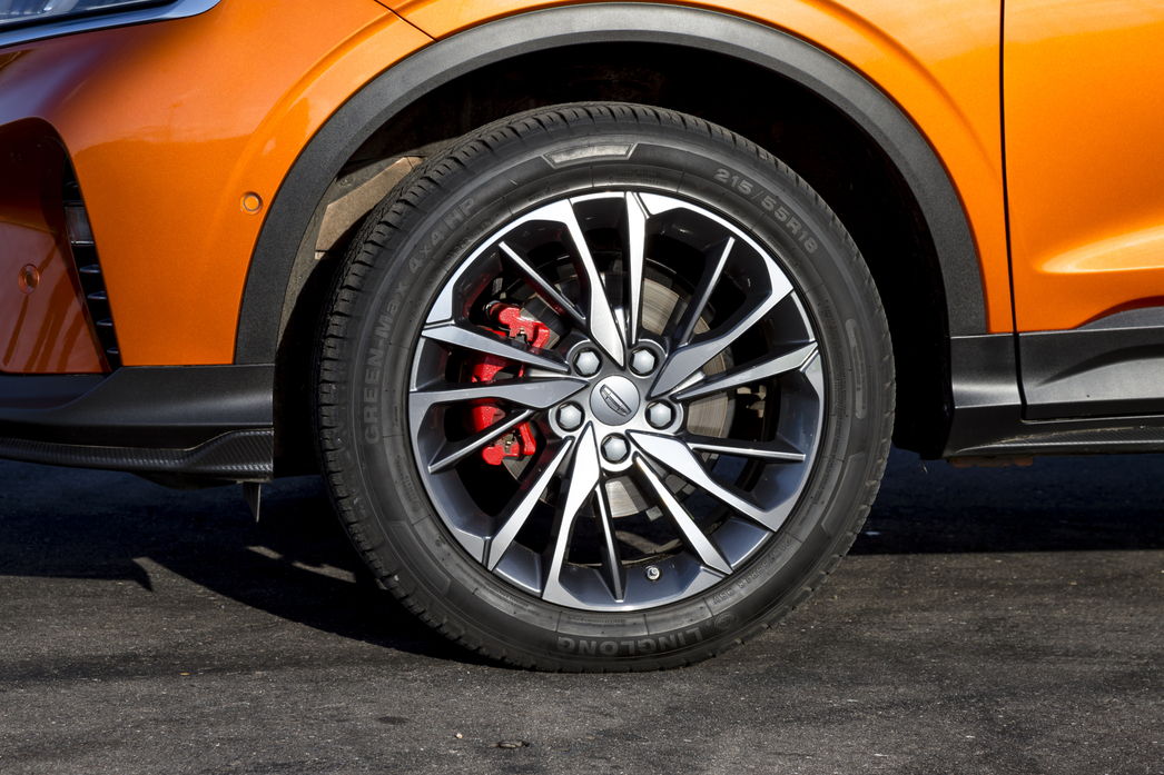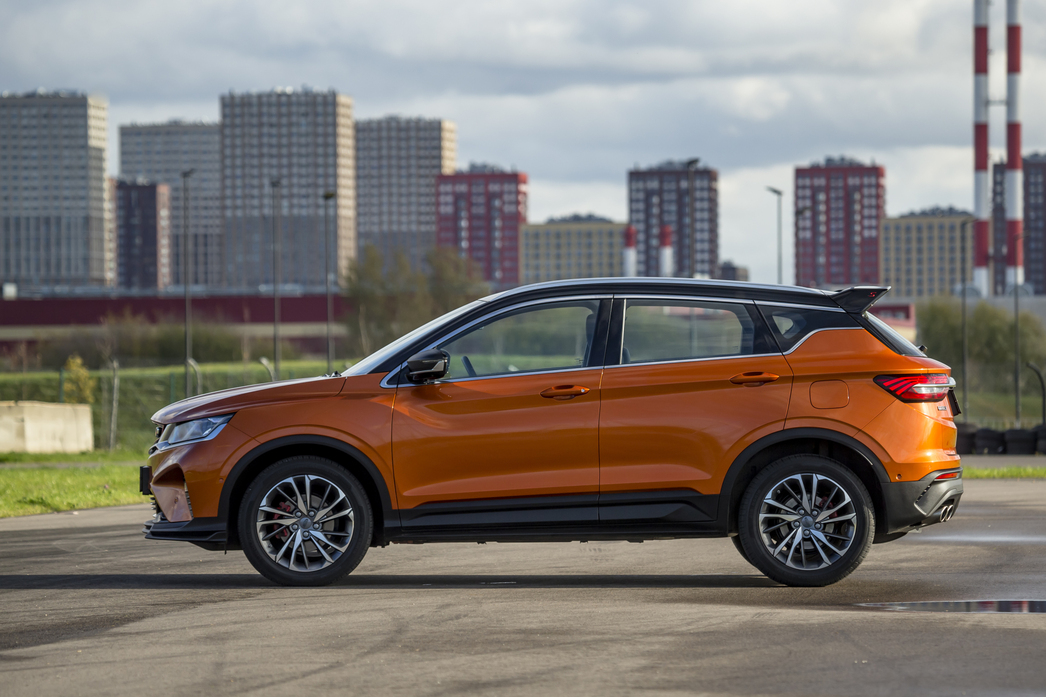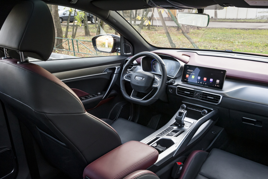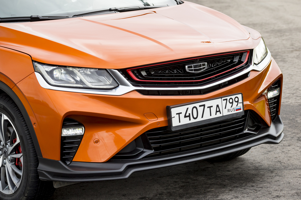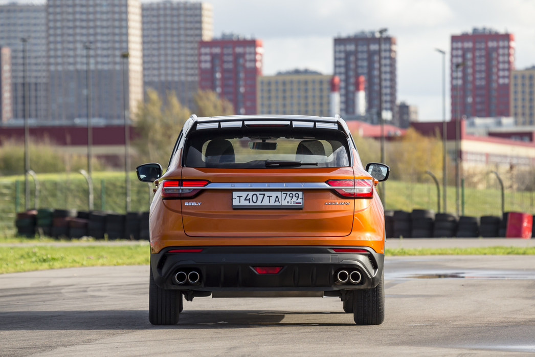 Немногим больше миллиона за новенький «паркетник». Да не абы какой — спортивный. Вы только посмотрите: красные тормозные суппорты, массивное антикрыло, двухцветное оформление кузова с перекликающимися контрастными оттенками, четыре патрубка выхлопной системы (не бутафория, между прочим), накладки под карбон. Ну чем не спорткар? Ладно, шутки в сторону — дизайн экстерьера, и вправду, удачен. Браво, Geely!