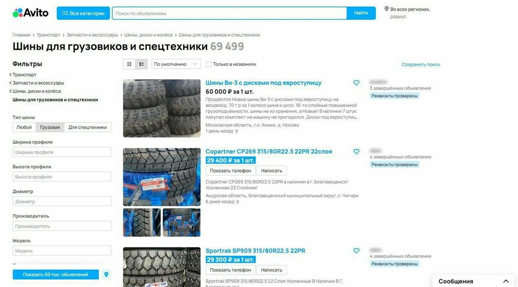 Количество предложений автозапчастей и комплектующих для грузового и коммерческого транспорта на Авито регулярно растет. На сегодняшний день на платформе можно найти более 100 тысяч объявлений о продаже новых шин (69 499 предложений для грузовиков и 38 983 для спецтехники). Предприниматели могут в несколько нажатий мыши настроить все необходимые характеристики для поиска резины: от производителя, диаметра и высоты профиля до цены, возможности доставки и рейтинга продавца.