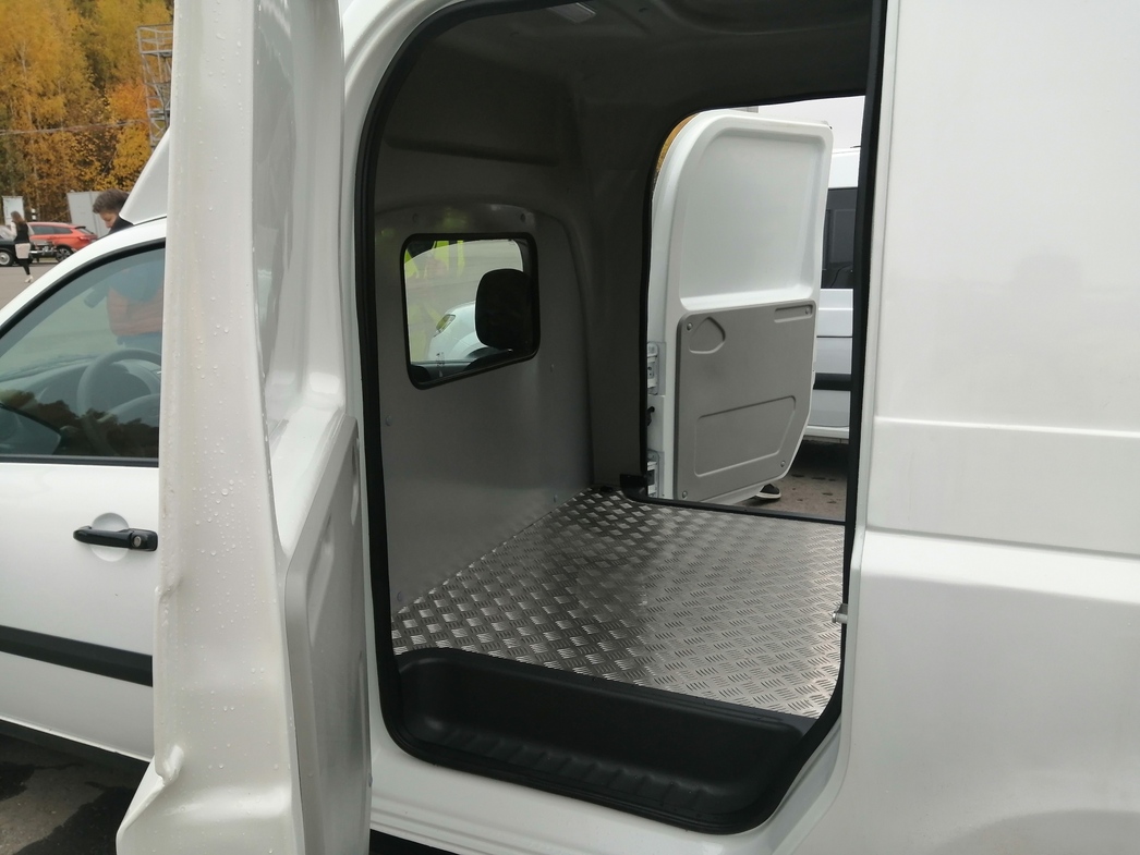 Благодаря такой операции, колесная база машины выросла со стандартных 2467 мм до 3050 мм. И задние двери фактически остались на месте — их интегрировали в конструкцию грузового фургона. Она, кстати, представляет собой стальной силовой каркас, несущий на себе пластиковые панели. Таким образом, в грузовую часть кузова имеется доступ как сзади, через распашные двери, так и с боков — через бывшие боковые пассажирские. Что для потенциальных пользователей очень кстати, так как полезный объем тут приличный: заявлен на уровне четырех кубометров: 2300х1400х1450 мм.