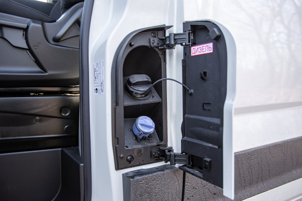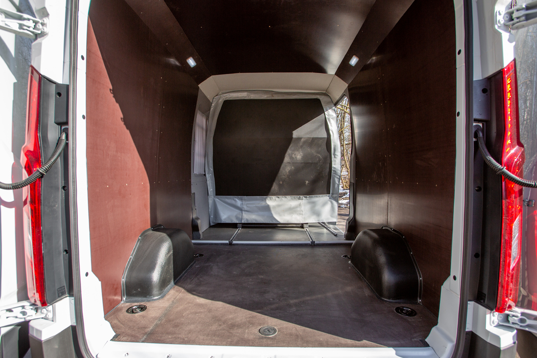 Из важного и рабочего: привлекают внимания усиленные петли распашных дверей на корме, хотя сами дверки «до борта» не распахиваются. Рельса сдвижной двери на боку обильно смазана и беззвучна в работе, но закрывается с усилием. Багажник уже обит ламинированной фанерой, что, несомненно, продлит срок службы и усилит комфорт от взаимодействия с машиной.