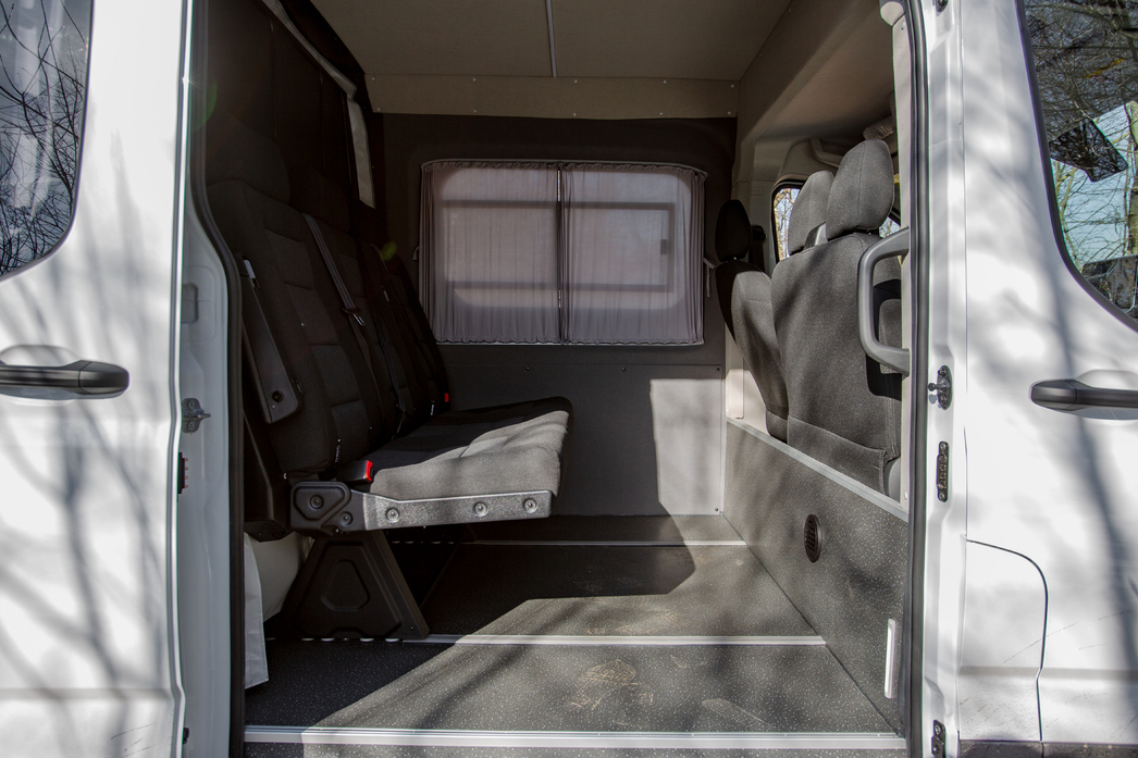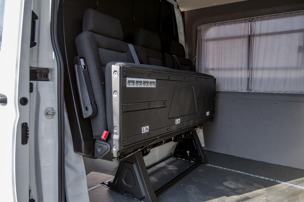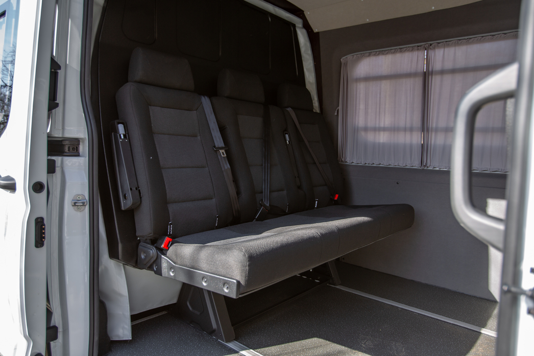 Да, у нас версия комби — трое спереди и трое сзади, да еще и со сдвижной стенкой: «квадратные метры» пассажирского и багажного отсека можно регулировать на свое усмотрение. Круто? Не то слово: простой ручной механизм, позволяющий двигать и фиксировать диван по рельсам — очень удобно.