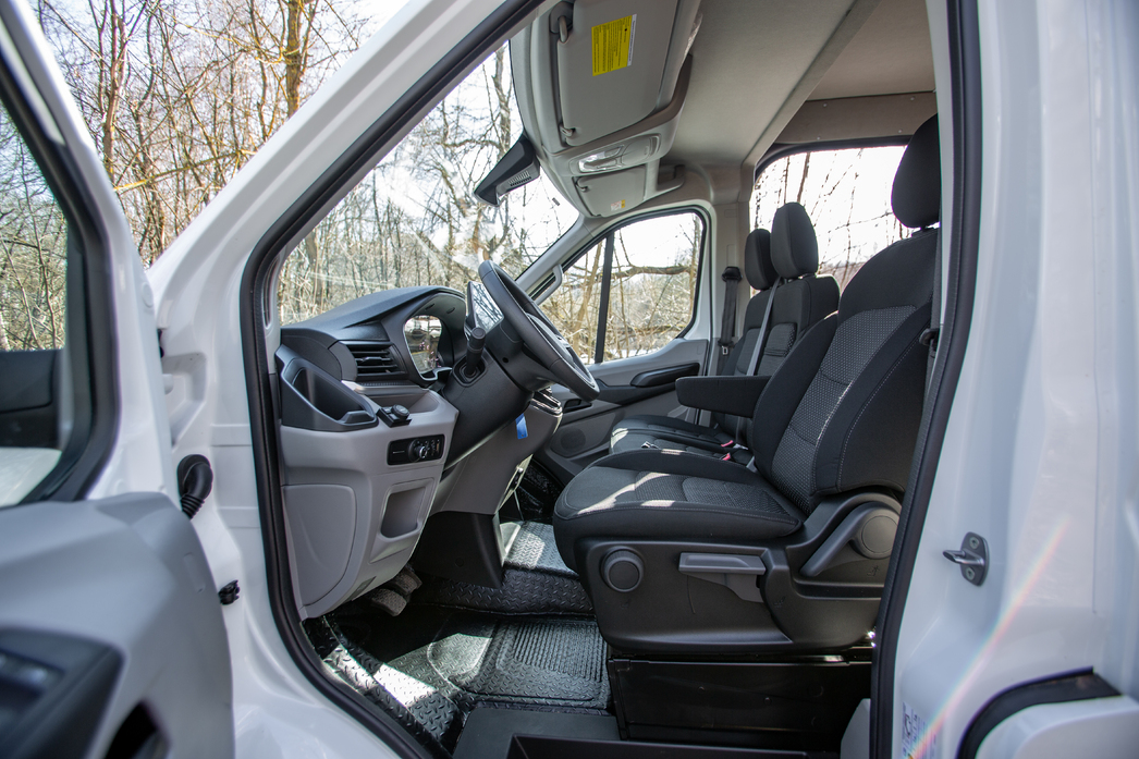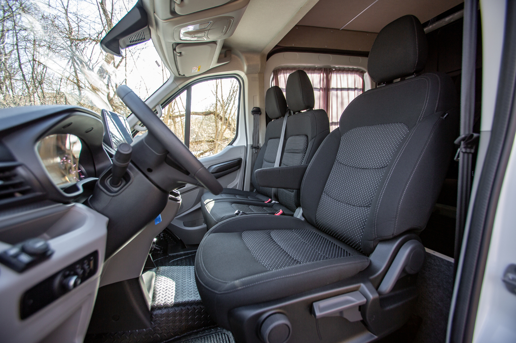 В салоне достаточно удобно, хотя руль по вылету не регулируется — только по наклону, кресла приличные — спина на коврик не вываливается даже после четырех часов за рулем, про полочки и подстаканники производитель не забыл. Разве что не хватает места для так любимых логистами папок и бумаг, но «антресоль» над водителем теоретически с такой задачкой справится.