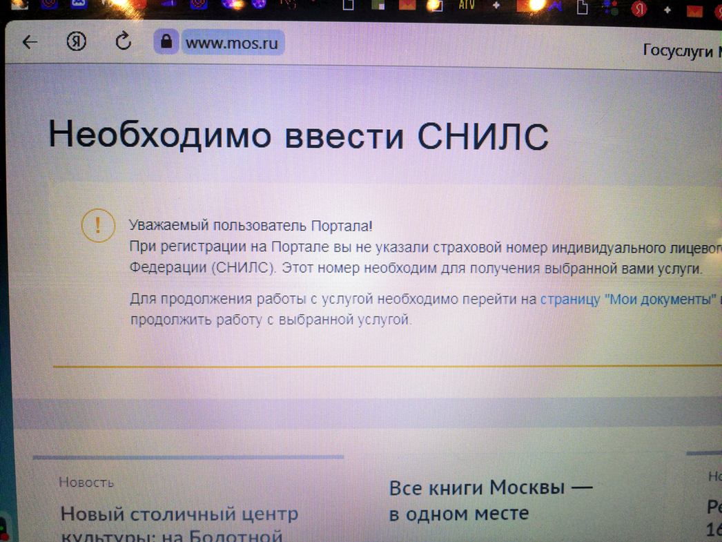 Ну хорошо, допустим, у вас есть учетная запись на сайте столичного градоначальника и вы решили-таки подать заявление на постановку своей техники на учет. Да вот засада: если номер вашего СНИЛС не подтвержден в «учетке» на портале, то попытка получить номер на снегоход или квадрик с треском провалится.