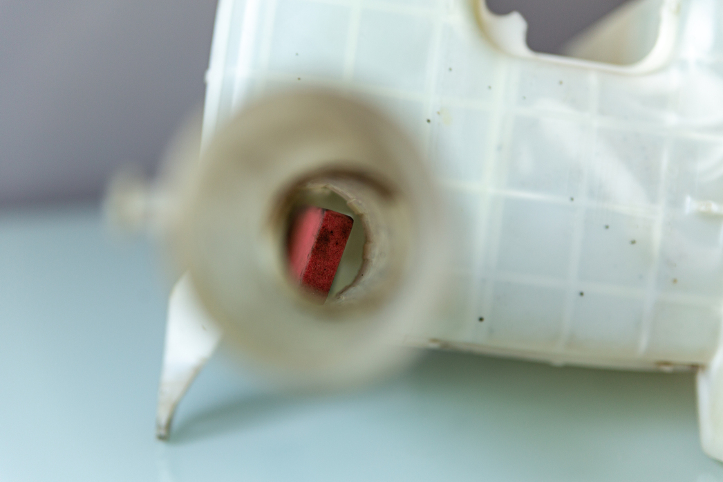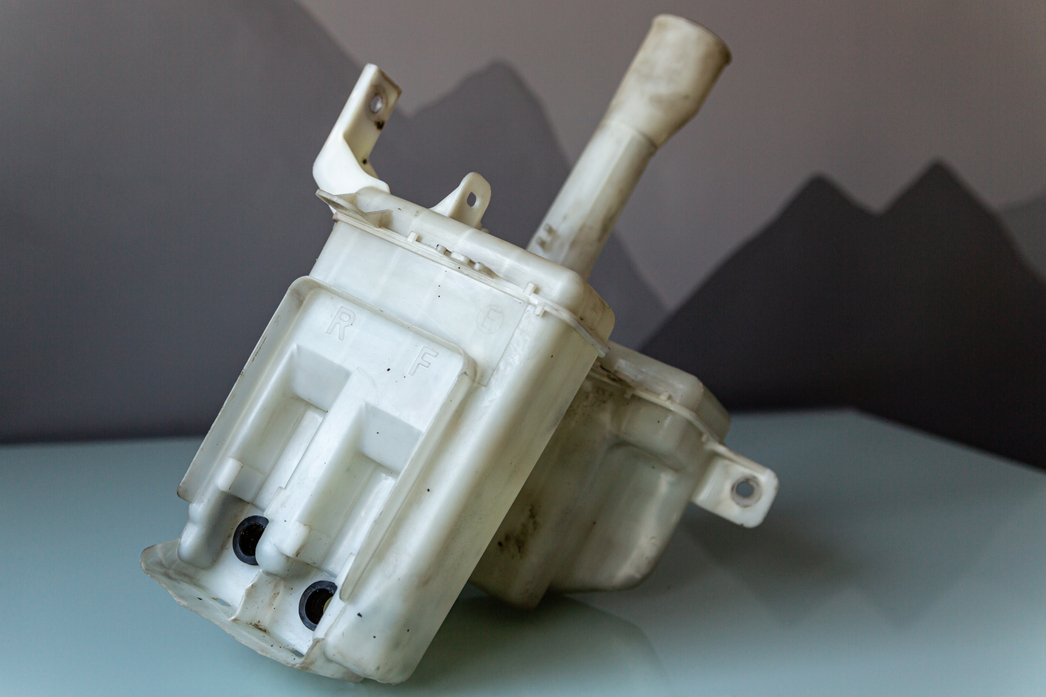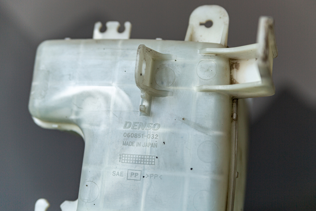 Снятие бачка подтвердило наши догадки: решето. Обычно бачок, который в нашем случае стоит впереди, прямо под бампером, приходит в негодность от столкновения, но в конкретно ситуации виновником неудобств и трат стал генерал Мороз. Залитая прошлым владельцем вода превратилась в лед и разнесла резервуар буквально в щепки: стыки, рельефные места и прочие изгибы покрылись паутиной трещин, сквозь которые незамерзающая жидкость вытекала полностью за несколько секунд.