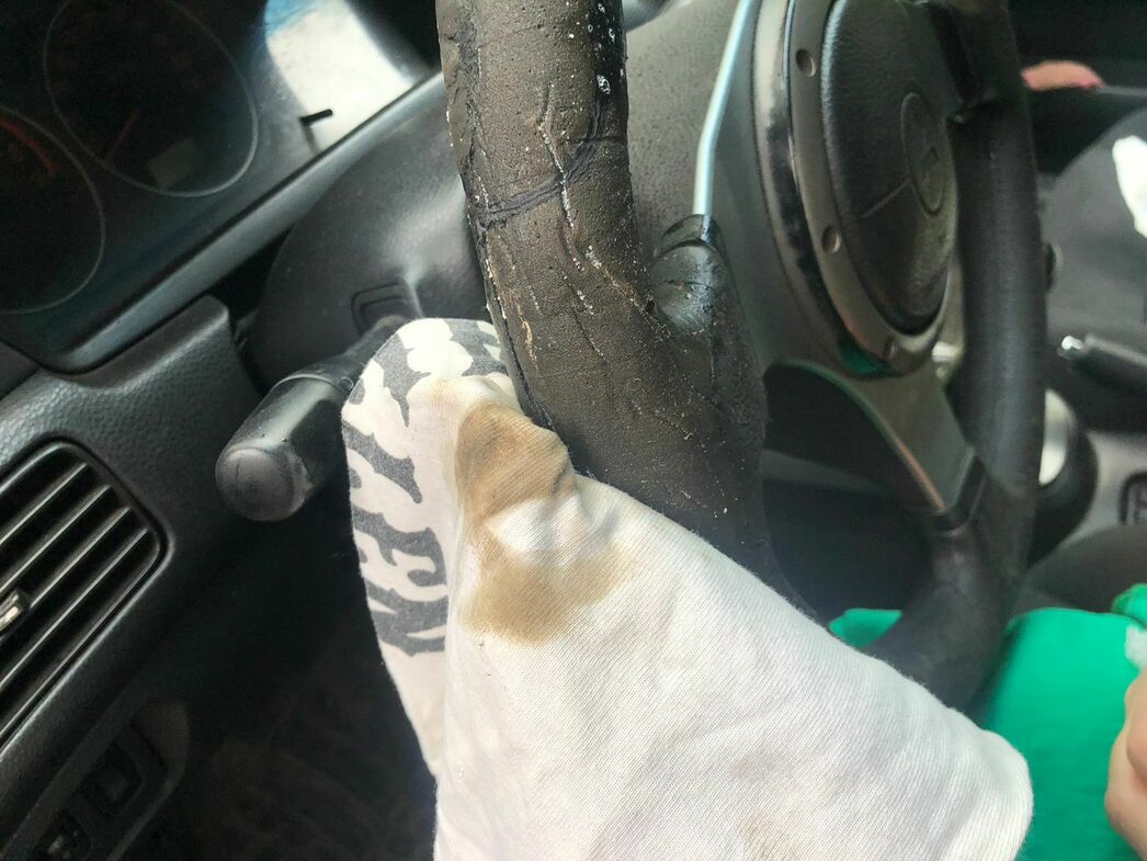 Судите сами: первая же обработка рулевого колеса пенным составом показала, что внутри пор и перфораций скрываются килограммы грязи, накопленных за 18 лет эксплуатации. Пена становится бурой за секунды, вытягивая жир, но просто смахнуть моющее средство недостаточно: следующее нанесение картины не меняет.