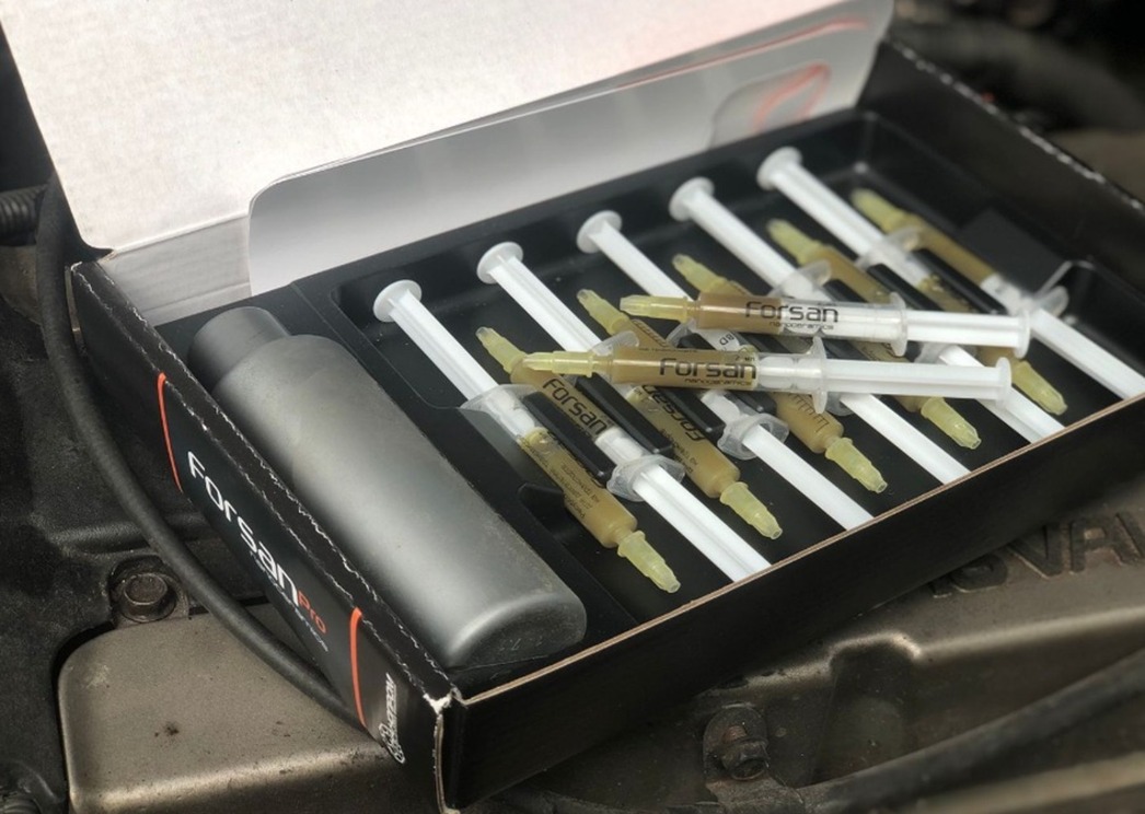 Всего существует два вида препарата Форсан от компании Нанопром: для самостоятельной обработки двигателя и для профессиональной, которую делают на сертифицированных СТО. Профи вариант дороже, сложнее, но и функциональнее, так что в нашем случае, мы предпочтем его. При этом технология не требует разбора узлов, а состав вводится через стандартные маслозаливные отверстия. Мотор запущен, так что идем сразу по большому кругу — так выше вероятность достигнуть успеха.
