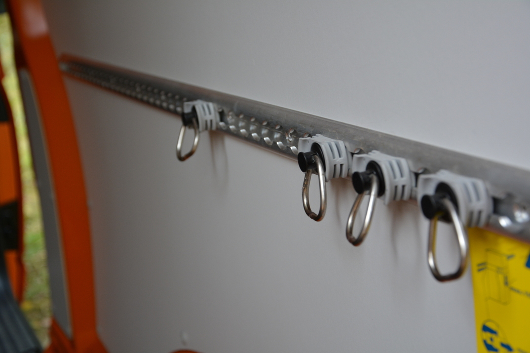 Тут предусмотрен целый «букет» крепежных колец и проушин на полу и бортах. Причем бортовые можно по своему усмотрению перемещать по специальным направляющим!
