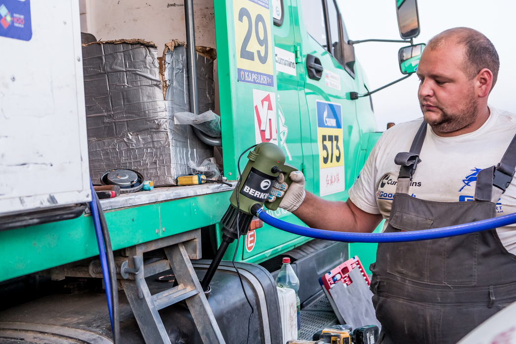 Да, газовские серийные авто выдержали все нагрузки. Правда, как уже говорилось, без некоторой подготовки все же не обошлось. Так, поскольку каменистое покрытие чередовалось с песком? за один день приходилось не раз менять давление в шинах. Для этого на гоночных «Газель NEXT» была установлена пневмосистема «Беркут», включающая в себя мощные компрессор и ресиверы. Благодаря ей гонщики надували колеса с 1 атм до 2,5 за считанные минуты: отстегнулся, выскочил, размотал шланг, накачал и потом вновь собрался. С обычным компрессором времени уходило раза в два больше.