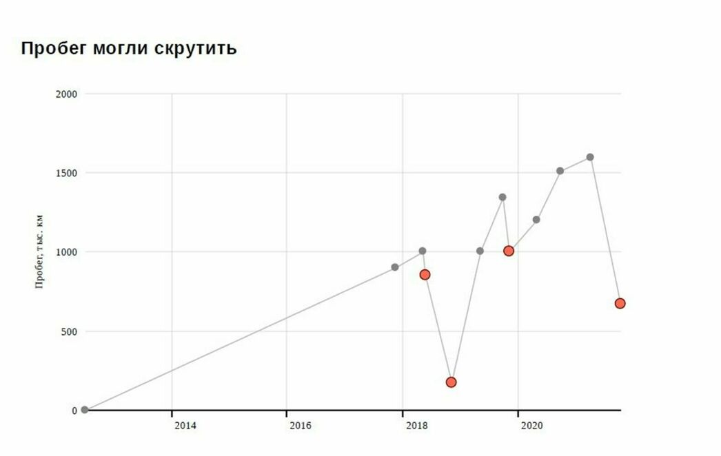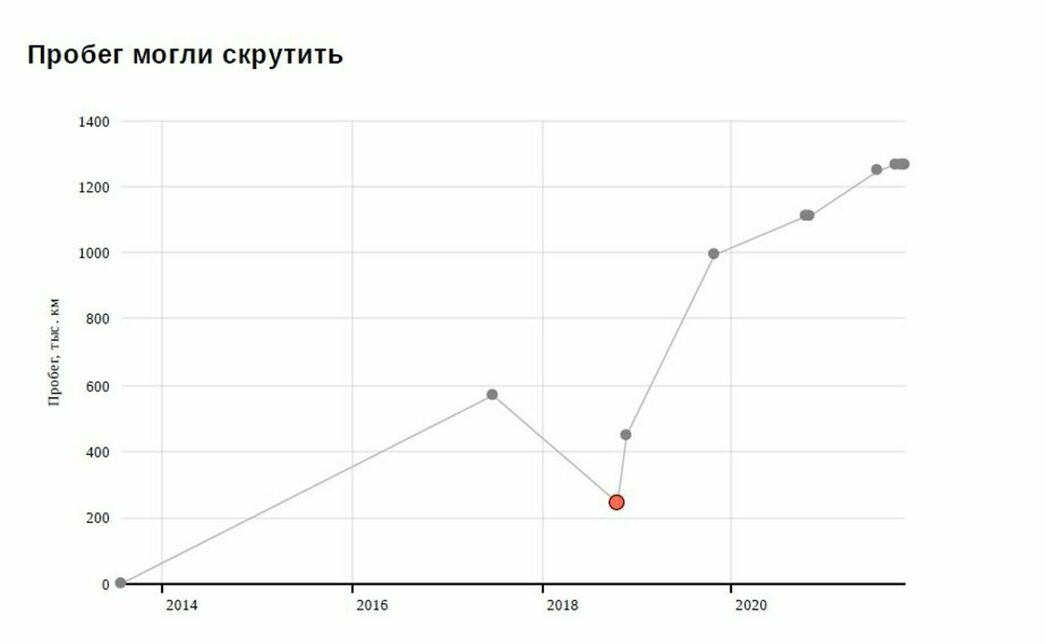 Идем дальше по отчету и видим три ДТП — два в 2015-м и одно в самом начале 2021 года. Все бывает. Тем более что аварии, по всей видимости, не носили серьезного характера. Теперь смотрим информацию о пройденных техосмотрах. Что это — при занесении информации в карту от ноября 2017 года эксперт зафиксировал пробег 900 000 км. Это явно больше озвученных в объявлении 670 490 км. Посмотрим график изменения пробега. А вот и момент истины! Пробег скручивался трижды на весьма большие значения в 2018 и 2020 годах. На одометре должно быть под два миллиона километров. Даже если мотор грузовика был капитально отремонтирован или вместо родного ДВС стоит «контрактный», этот тягач бизнес не потянет.