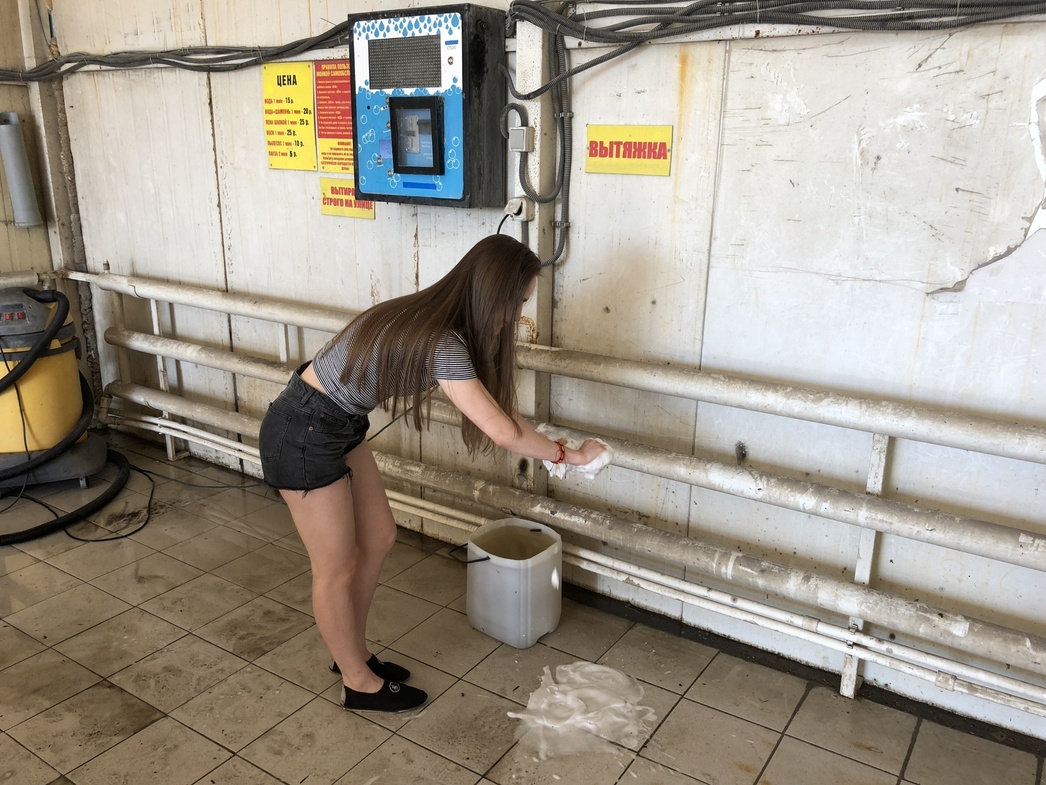 Аппарат проглотил еще четыре десятки — согласно прайсу, это примерно полторы минуты подачи моющего средства. И хотя сам процесс нанесения шампуня куда более приятный, я и здесь умудрилась напортачить. Пена беспорядочно вылетала из пистолета, оседая на стенах бокса, моих волосах и ботинках фотографа. С горем пополам мне все же удалось покрыть кузов очистителем. Кстати сказать, не думаю, что он был чем-то разбавлен.