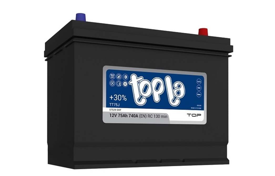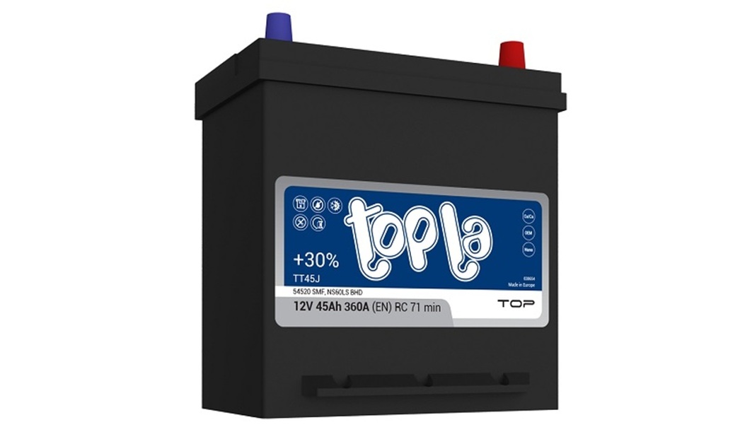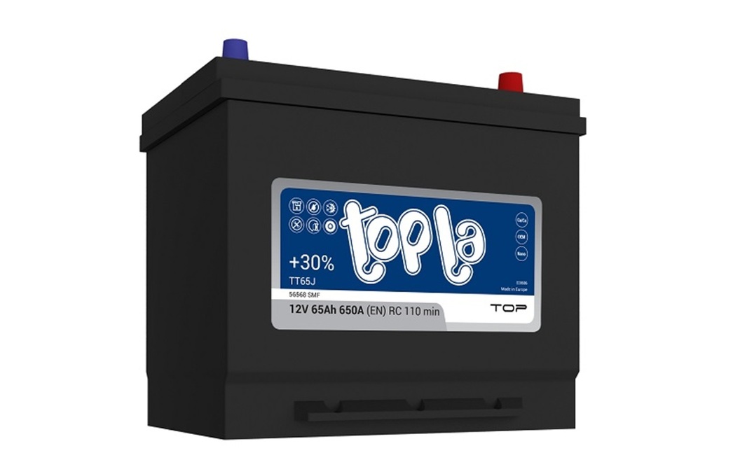Эти моменты можно наглядно проследить на примере популярных АКБ бренда Topla. В его ассортименте есть широкая линейка «азиатских» стартерных батарей Topla Top JIS, изготовленных, как видно из самого обозначения серии, согласно стандарту JIS. Как уже отмечалось, одна из его особенностей касается расположения клемм на корпусе. Это можно заметить сразу — у АКБ линейки Topla Top JIS контактные выводы выступают над крышкой, как рожки.