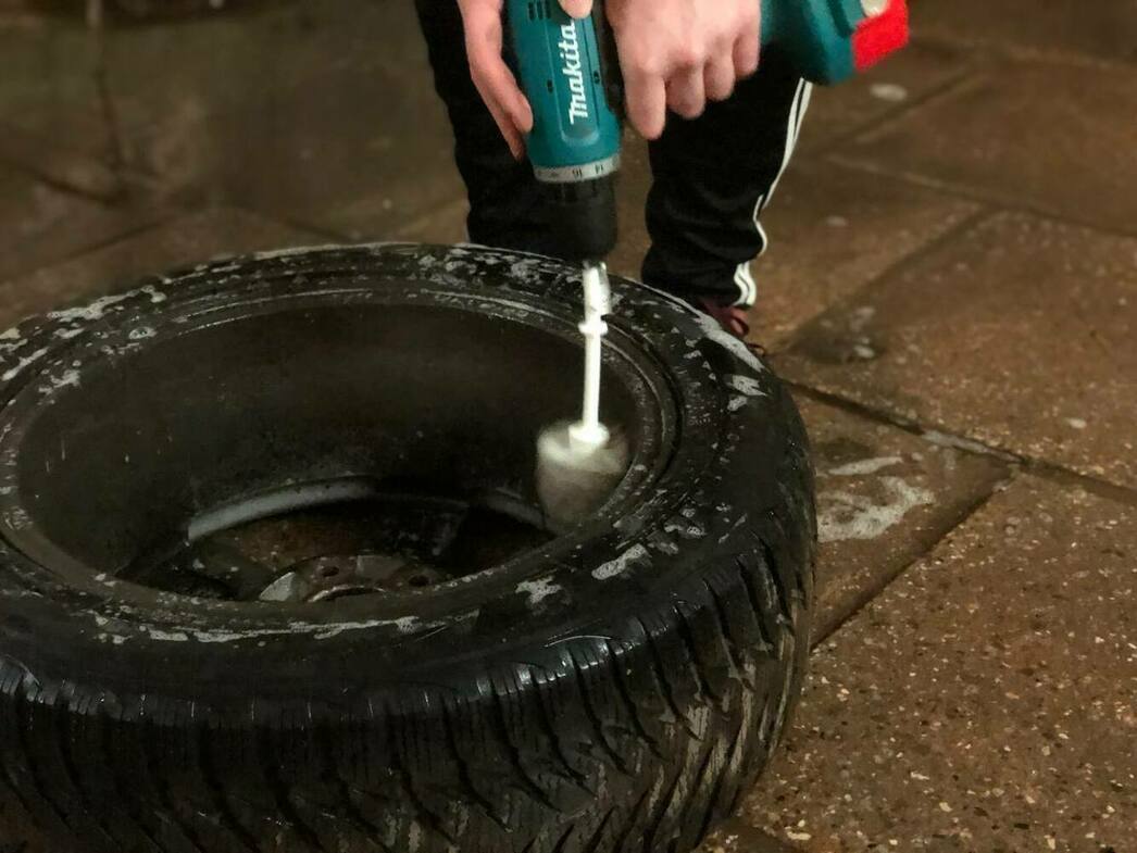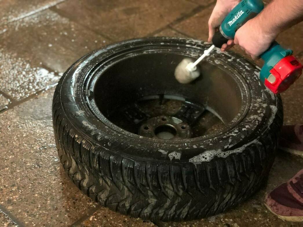 Сначала надо колеса отмыть. Наша цель — сэкономить, поэтому никаких спецсоставов и оборудования, только моющее средство — слить из домашней бутылки — и шланг с водой. За 17 лет, прошедших с момента прибытия этих дисков в Россию, грязи на них налипло немало, так что предстоит применить лайфхак из интернета: берем ершик для унитаза, подрезаем ручку, вставляем в шуруповерт и обдираем грязь импровизированной электрощеткой.