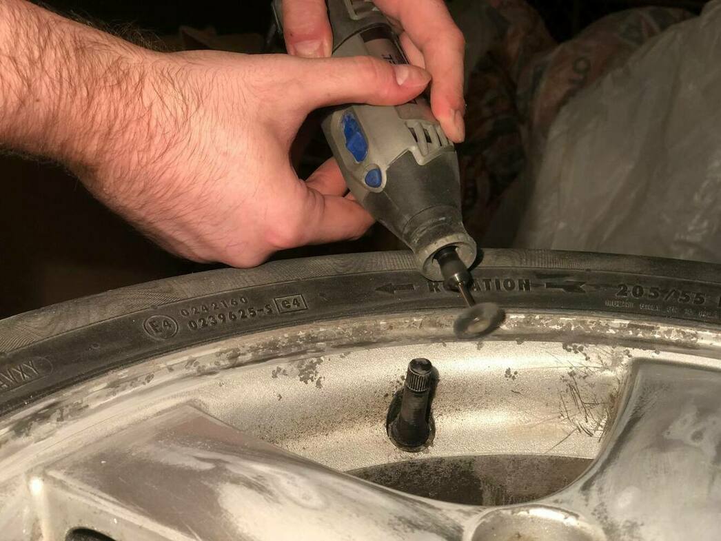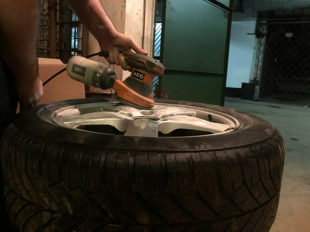 Итак, колеса готовы к первому этапу перерождения: снятие старой краски в местах ее вздутия и «обшаркивание» лака, которое необходимо для фиксации грунта. Этот процесс тоже неплохо было бы механизировать, но тут случилось фиаско: ни «шлифок», ни Dremmel — он же бормашина — добротного результат не дали.
