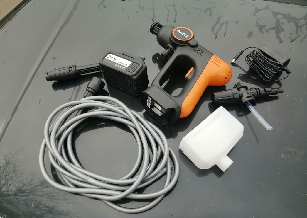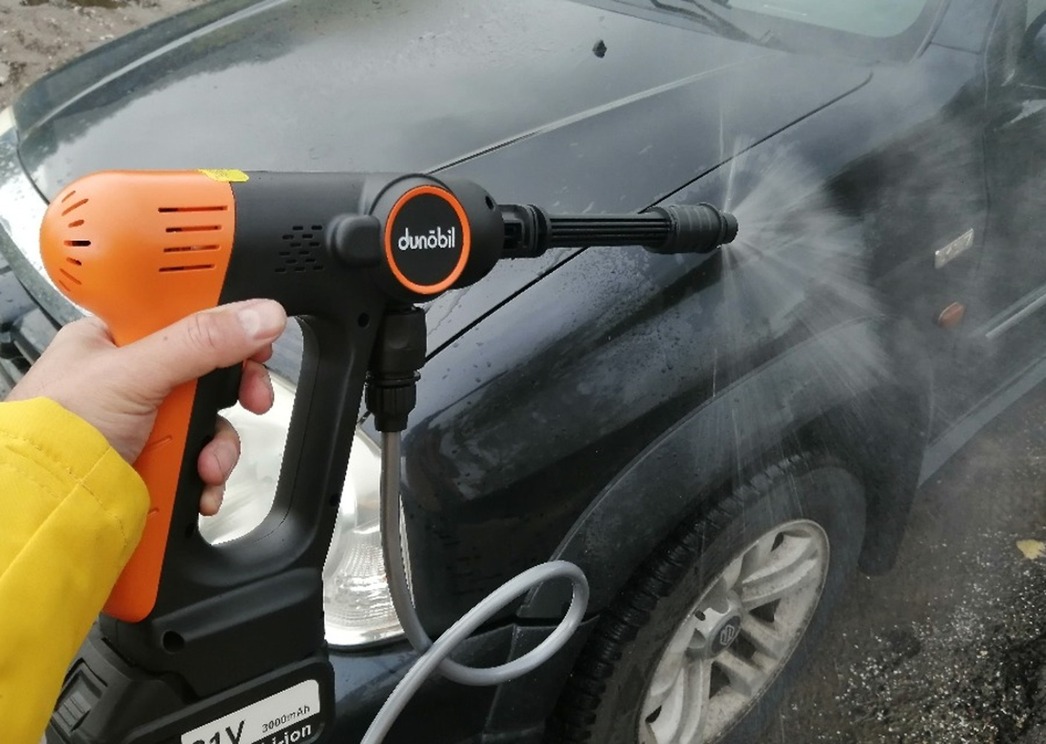 Что общего у мойки высокого давления и бытового шуруповерта? Например, компоновка. У мойки Dunobil Washer Basic, тестирование которой мне было поручено осуществить, она точно такая же, как и у «шурика» — «пистолетная», назовем ее так. Она не требует постоянного подключения к электросети, поскольку питается от аккумулятора в ручке девайса. Вес — что-то около пары килограммов. Можно ходить и «стрелять» струей воды куда в голову взбредет. Практически мечта моего босоногого детства.