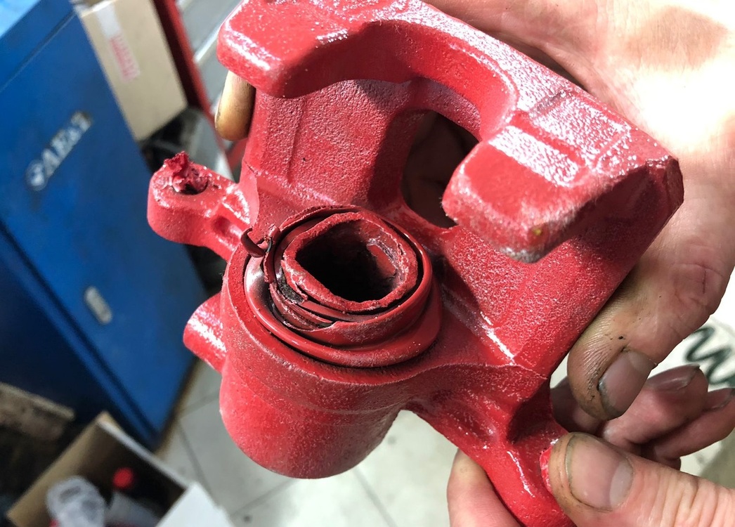 Далее разбираем суппорт: он представляет собой кусок «чугунины», где находится цилиндр с поршнем, являющиеся на пару основным «движущим элементом», а также небольшой клапан — в нем происходит прокачка тормозов. Клапан этот нужно регулярно менять: он имеет свойство забиваться, гнить, а после — просто ломаться, вследствие чего приходится высверливать негодные остатки, а порой и менять суппорт целиком.