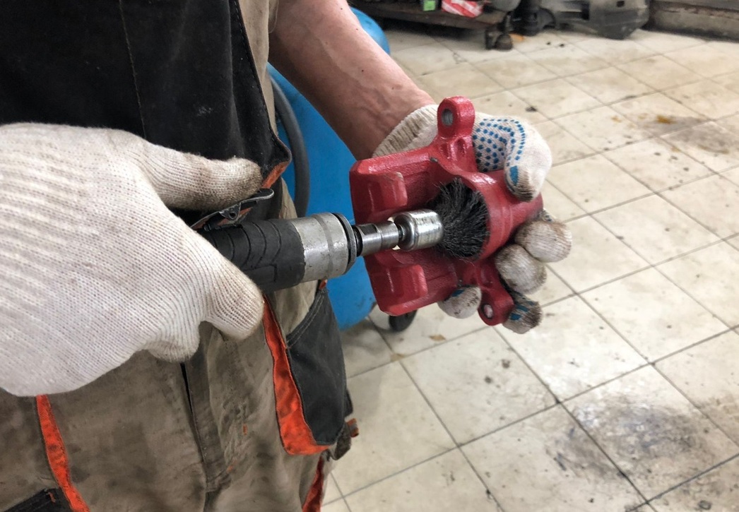 Сначала легкая чистка, потом тотальный «очиститель тормозов», далее — сборка. На сам поршень, на стенки цилиндра, на резиновый сальник с внутренней стороны наносится специальная смазка — гордость поклонников бренда «Тойота». Ей же обрабатываются направляющие. Затем все это дело аккуратно собирается, устанавливается на колесо и только потом, в самый последний момент, закручивается «сапун» — клапан прокачки тормозов. Уж слишком легко и зачастую случайно он ломается.
