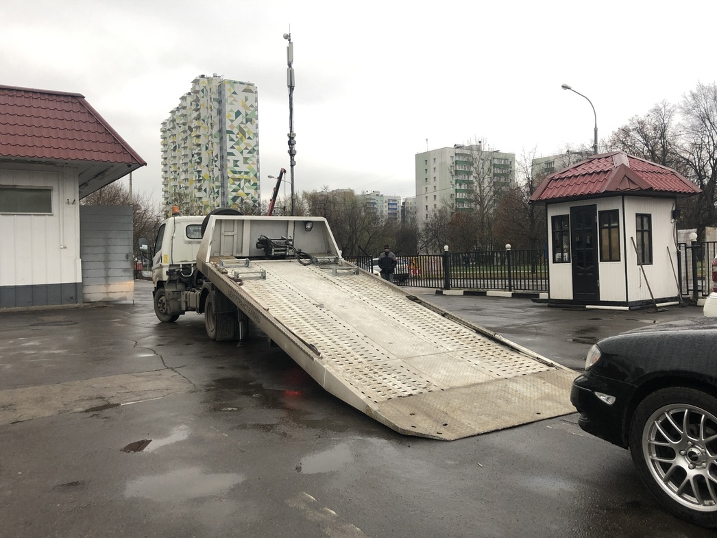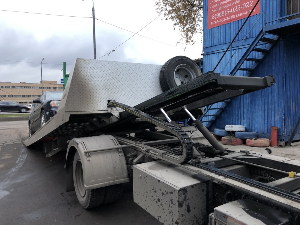 Свое обещание он сдержал — машина показалась на горизонте ровно в 14:00. Погрузка заняла минут десять: водитель эвакуатора припарковался, опустил платформу, помог на нее заехать, подкручивая руль, и закрепил колеса специальными ремнями. Как только мы выехали в сторону автосервиса, со мной вновь связались специалисты РАМК — уточнили, прибыла ли к нам помощь. Заботятся о клиентах, приятно.