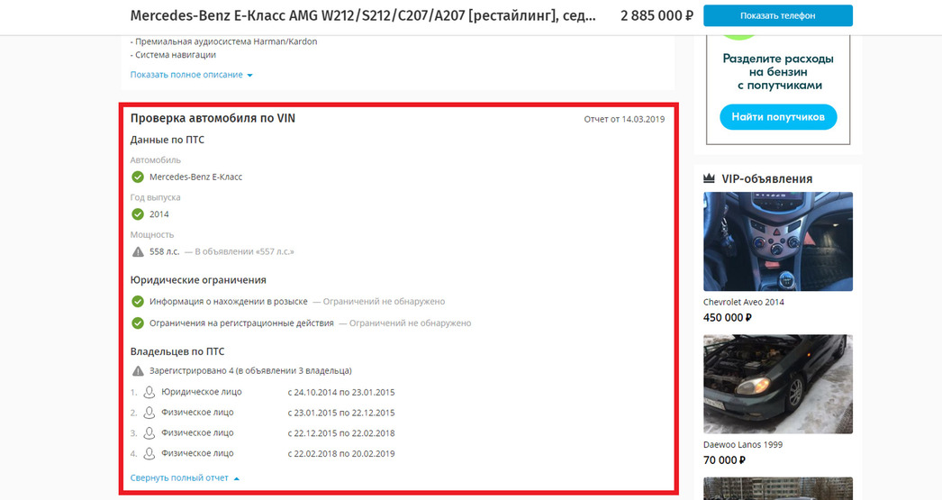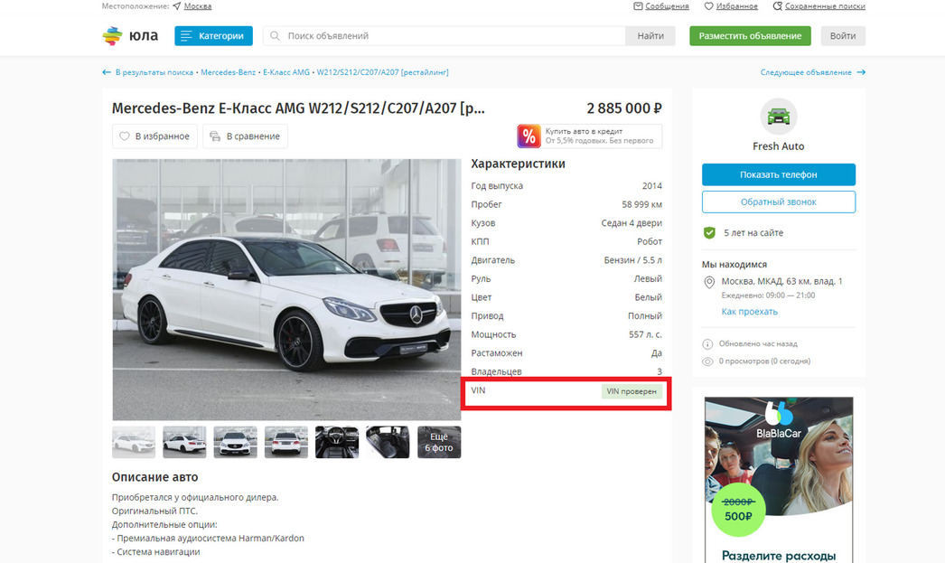 Да просто последние два предпочли не перерегистрировать авто в ГИБДД, и поэтому в базу они не попали. Но вроде бы проверяющая все и вся «Юла», чей сервис опубликовал объявление о продаже Mercedes-Benz Бузовой, об этом не сказал ни слова. Как, впрочем, и не сообщил о том, что в действительности машина не 2014-го года выпуска, а на два года старше.